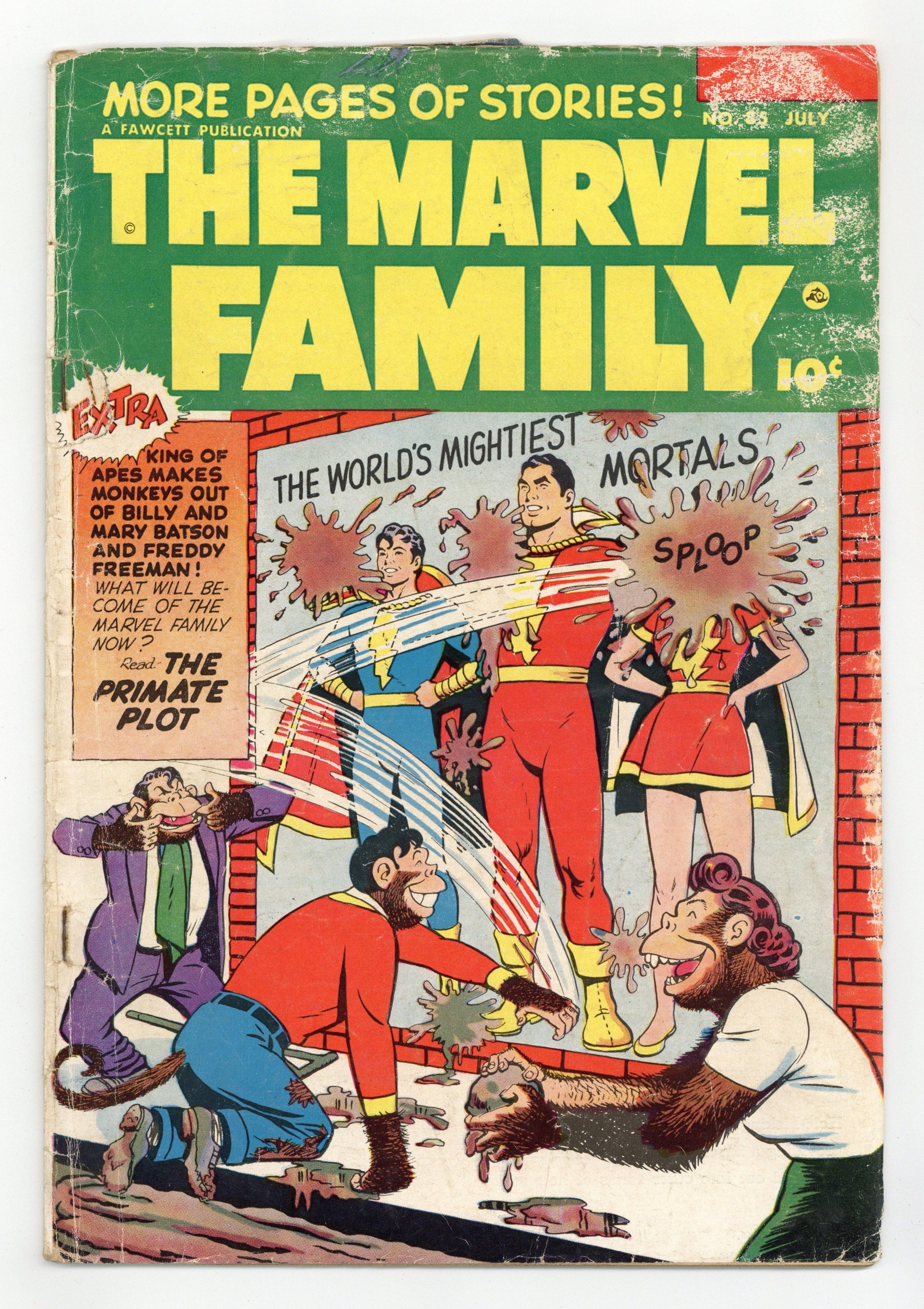 Cover by C. C. Beck. Stories and art by Otto Binder, Kurt Schaffenberger, Bill Woolfolk, Bud Thompson, Art Helfant and Howard Boughner. Fawcett's most popular heroes, the original Captain Marvel (Shazam) and family, in solo and shared adventures. In a multi-part adventure, an empire of the apes is discovered in the remote Amazon jungle. Vampira manages to awaken the Beast of Shenshu and send him after US forces in Korea, but Captain Marvel, Jr. is there too. The Primate Plot, Chapter One: The Jungle Jigsaw; Chapter Two: The Ape Army Attacks; Chapter Three: World of Apes; Vacuum Bloobstutter: Crime at High Noon; Lost and Found; Vampiras Beast of the Battlefield; Colonel Corn and Korny Kobb. 32 pages, Full Color. Cover price $0.10.