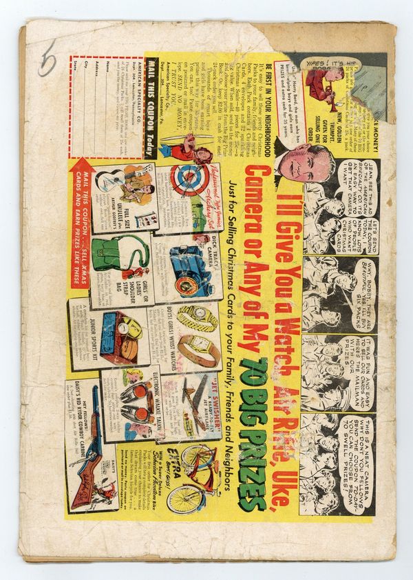 Cover art by Kurt Schaffenberger. Death's Direction text story by John Martin. Fights the Dark Curse; the Marvel family faces Sterling Morris. If The Shoe Fits starring Headline Harry, scrip and art by Howard Boughner. Then There Were None Ch. 1: One By One, art by Kurt Schaffenberger; The tenants of Mrs. Wagner's rooming house are disappearing, until only Billy Batson and Freddy Freeman are left. Then There Were None Ch. 2: Then There Are None; Billy and Freddy discover that everybody else in the boarding house has been replaced with robots. Then There Were None Ch. 3: Robots Robots Robots; Billy and Freddy rescue the rest of the members of Mrs. Wagner's boarding house from Lem Blucher and his robot replacements. Last app. of Captain Marvel, Captain Marvel, Jr., Mary Marvel, Prof. Edgewise, Mrs. Wagner, Red O'Reilly, Leroy Marks, & Jim Bellows until Shazam! #1. 36 Pages, Full Color. Cover price $0.10.