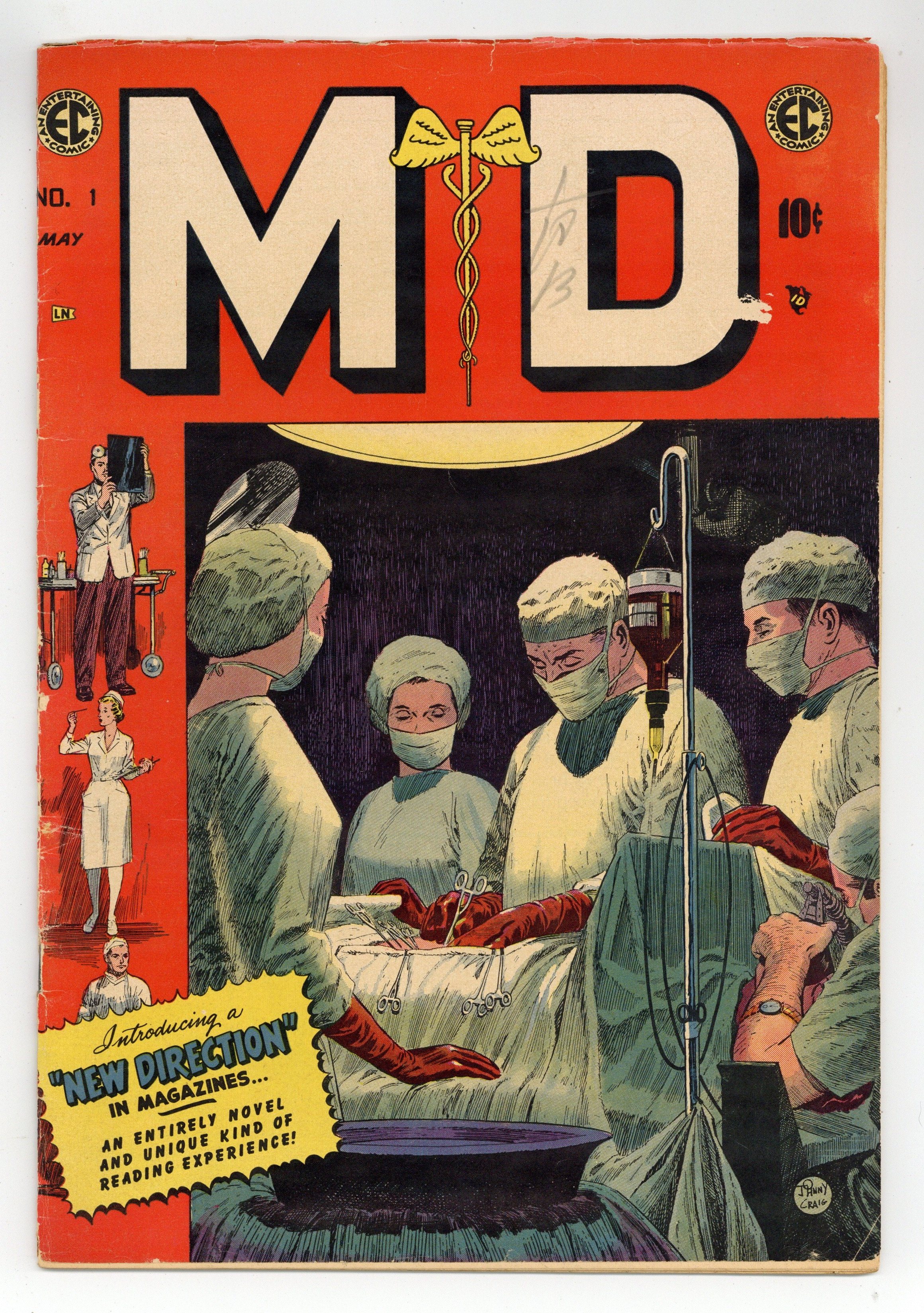 Cover by Johnny Craig. Art by George Evans, Joe Orlando, Johnny Craig, and Reed Crandall. One of EC Comics' late New Direction titles, a response to the new Comics Code, featuring medical drama. The history of medicine is told in comics form, from caveman days to modern times. A couple's fight over medical bills intensifies when their child faces a medical emergency. A doctor diagnoses a boy with appendicitis and recommends emergency surgery. Stunning cover by Johnny Craig. The Fight for Life; Janie Some Day; To Fill the Bill; The Pain Killers; The Antidote. 32 pages, Full Color. Cover price $0.10.