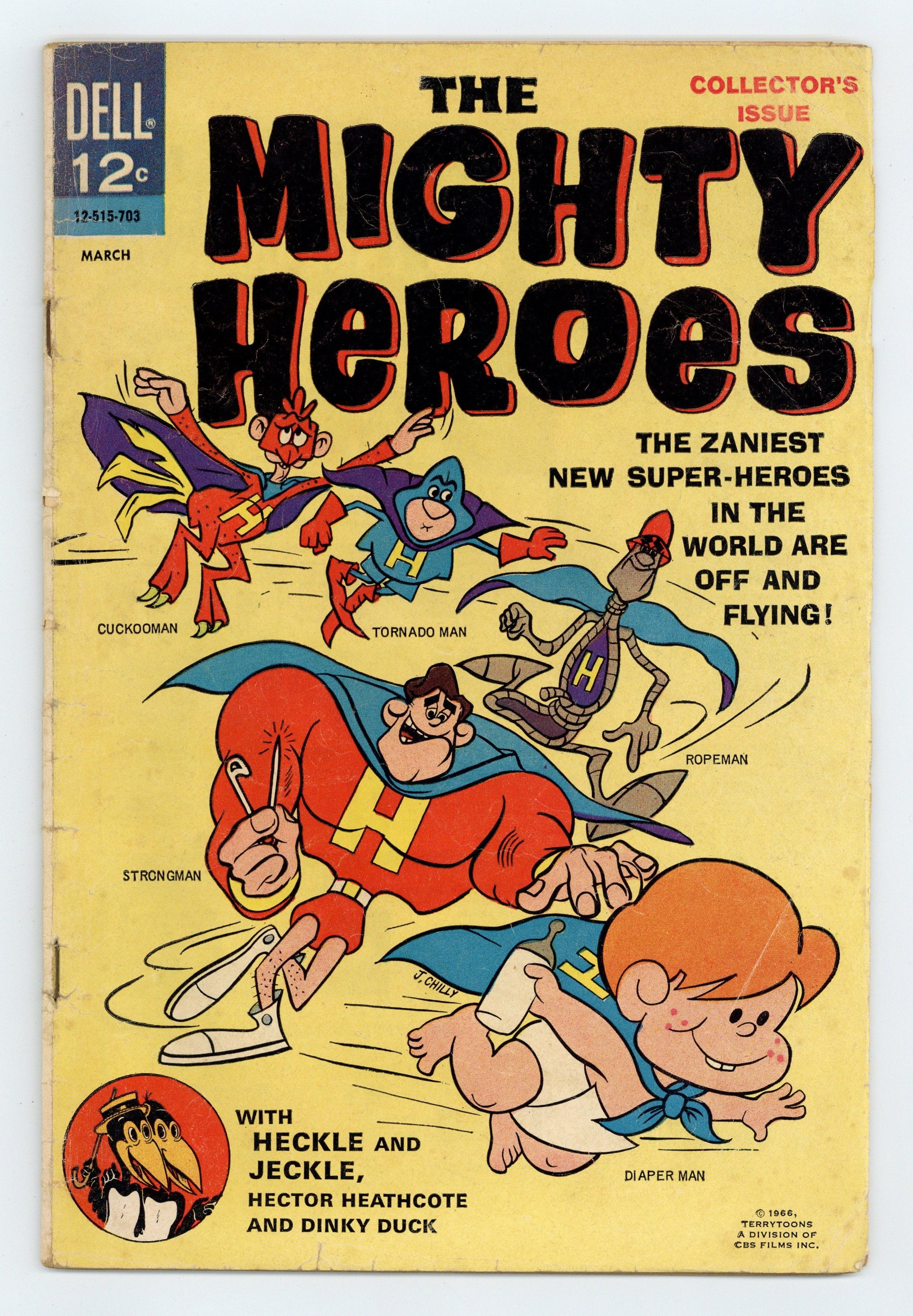Cover by J. Chilly. Stories by unknown. Art by unknown. The zaniest new super-heroes in the world are off and flying! Diaper Man, Strongman, Ropeman, Tornado Man and Cuckooman star in "Who's Afraid of the Big Bad Frog?" Plus back-up stories: Dinky Duck in "Dinky Diver"; Heckle and Jeckle in "Turn About Is Fair Play," reprinted from Adventures of Mighty Mouse (1955-1980 Pines/Dell/Gold Key) #134; and Hector Heathcote in "Hector the Protector"! 32 pages, full color. Cover price $0.12.