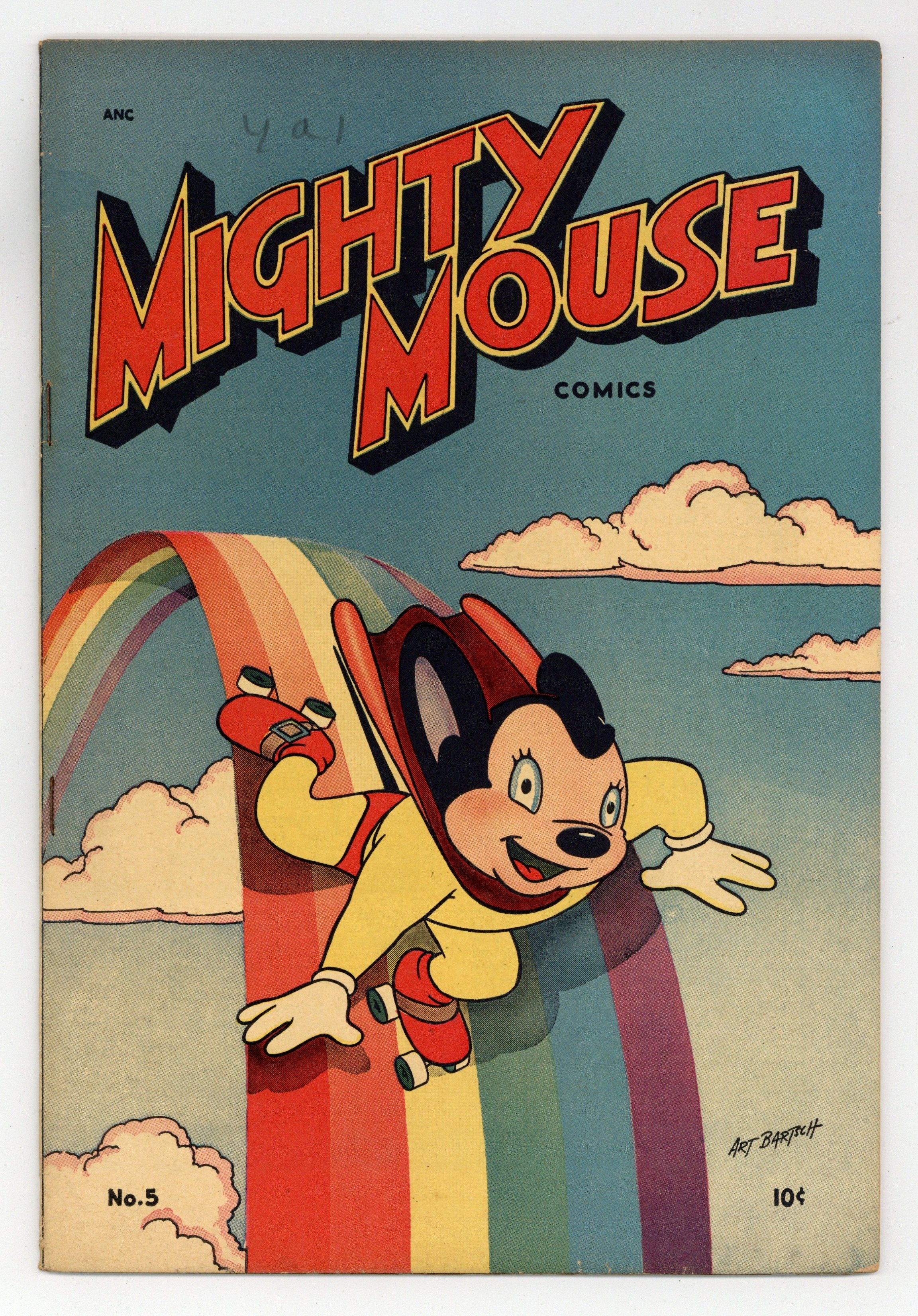 Cover by Art Bartsch. Art by Art Bartsch and Connie Rasinski. Numbering continues from Mighty Mouse (1946 Timely) #4. The world's mightiest mouse defends Mouseville from danger - mostly cats - in the comic-book adventures of the Terrytoons animated superhero. Several of these early issues included comics versions of classic Mighty Mouse cartoons; some of the artists worked on the cartoons as well. A cat steals Aladdin's Lamp and commands the genie to bring him every mouse in town - which includes Mighty Mouse. This is a new story, not an adaptation of the Mighty Mouse "Aladdin's Lamp" cartoon. Baba the sheep tests Mighty Mouse's patience with his jokes, in an adaptation of the 1947 Mighty Mouse cartoon "Crying Wolf." Mighty Mouse visits Storyland and sets out to stop the Big Bad Wolf, in a partial adaptation of the 1945 Mighty Mouse Cartoon "Mighty Mouse and the Wolf." The Hungry Mouse; Aladdin's Lamp; Adventure in Mexico; The Sheep Who Cried Wolf; Mighty Mouse in Storyland. 32 pages, Full Color. Cover price $0.10.
