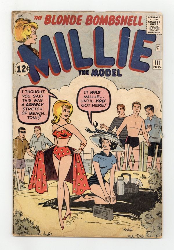 Cover art by Stan Goldberg. Millie Runs for Mayor!, A Peach of a Speech!, Putting One Over on Chili, and Millie and the Other Woman. Millie's Fashion Pin-up/Exciting Paris Imports, Chili's Classy Cut-out/Cruise Wear paper dolls. Millie's Many Moods! pinup. Time for Toni activity page. Stories by Stan Lee, art by Stan Goldberg. Beginning of the End text story, art by Joe Maneely. 36 pgs. $0.12. Cover price $0.12.