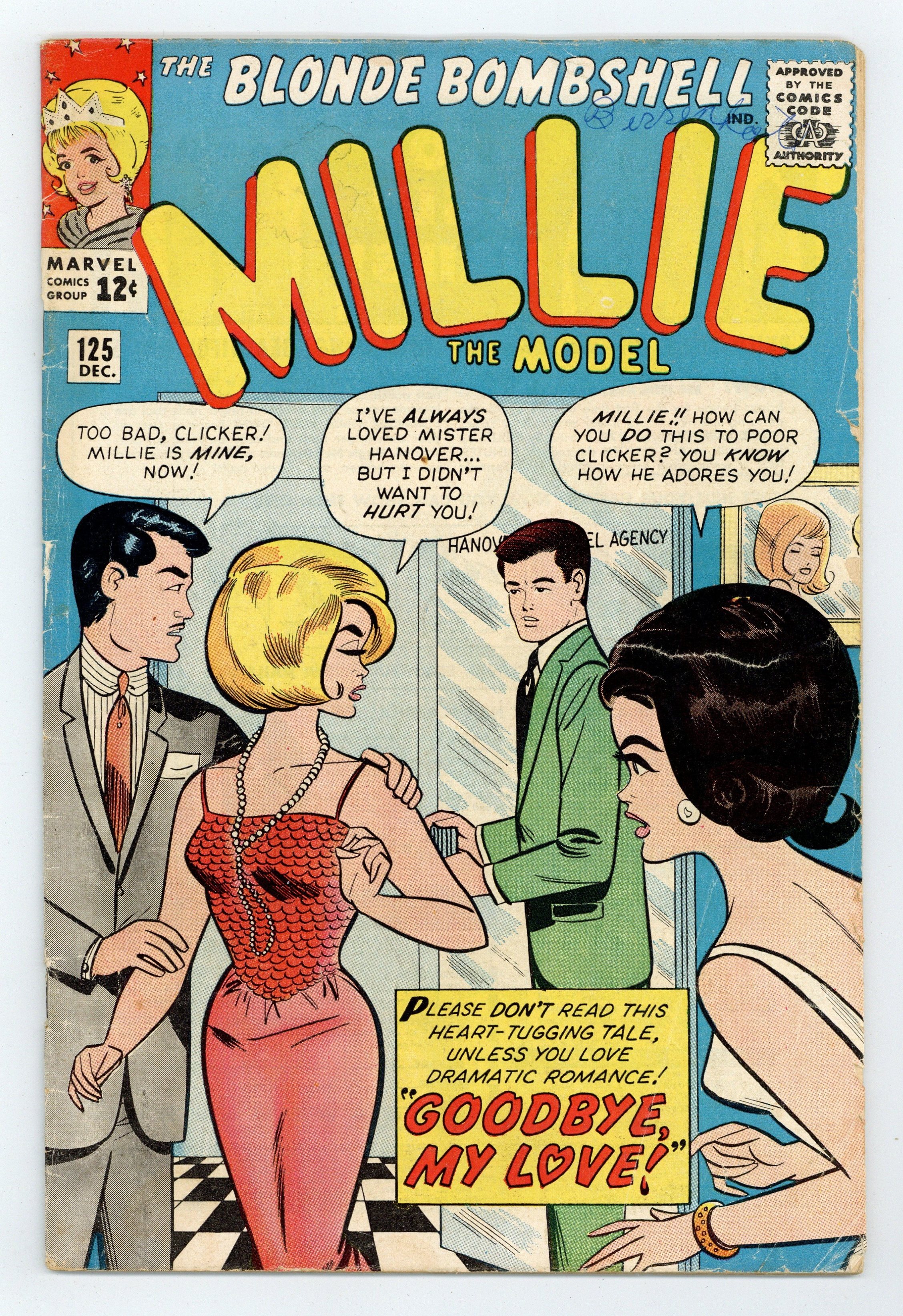 Cover art by Stan Goldberg. Goodbye, My Love! starring Millie the Model. Millie's Fashion Pin-Up, Chili's Classy Cut-Out, and Millie's Sensational Sport Clothes! paper dolls. Millie's Glamorous Gowns! fashion page. Chili and Toni's Charming Coiffures! fashion page. Letters page announced for next issue. Stories by Stan Lee, art by Stan Goldberg. 36 pgs. $0.12. Cover price $0.12.