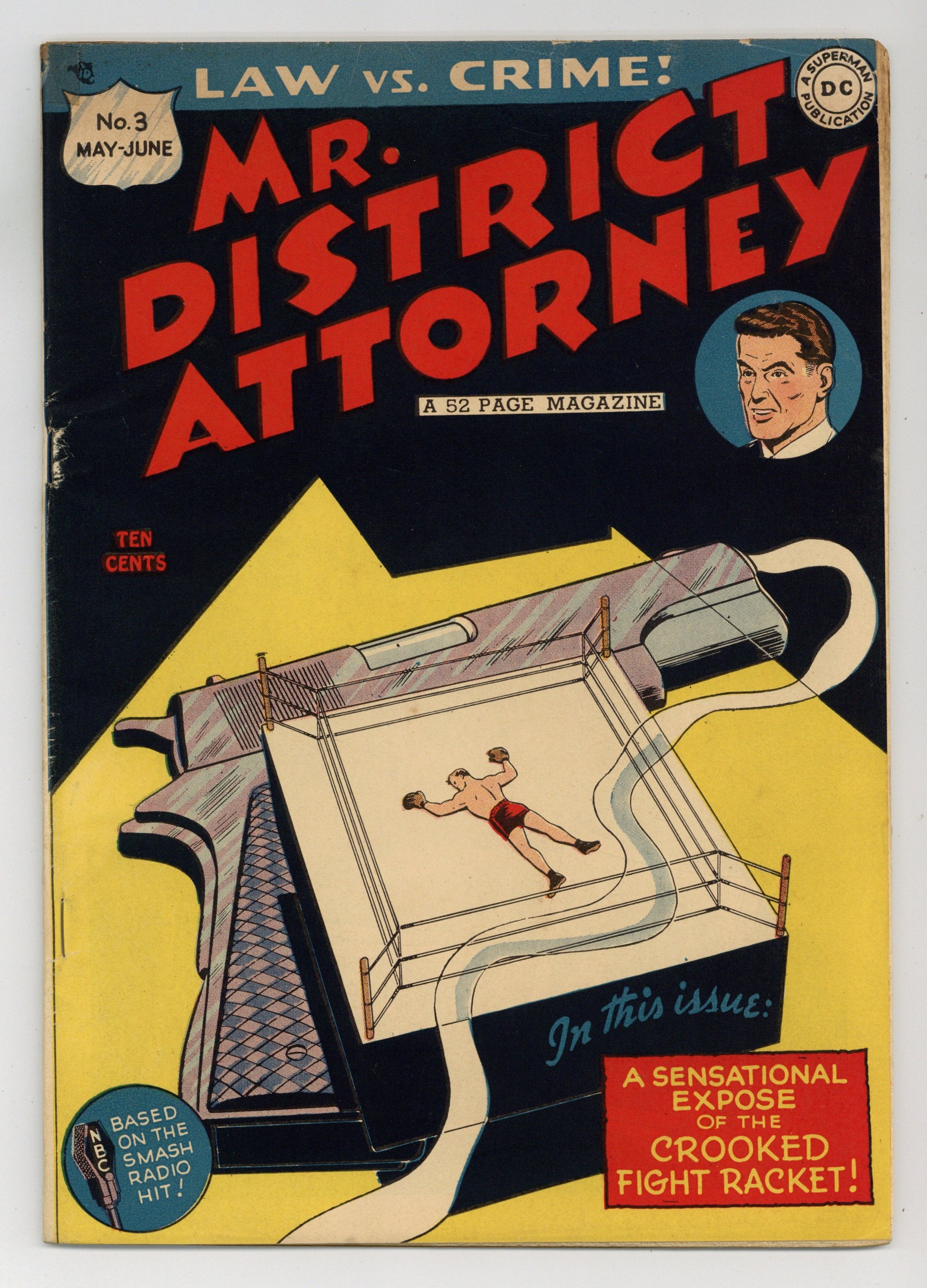 Cover by Win Mortimer. Stories by Ed Herron, Stookie Allen and unknown. Art by Ed Dobrotka, Charles Paris, Stookie Allen and unknown. Law vs. crime! Based on the smash radio hit! Mr. District Attorney in: "The Honest Convicts!" by Ed Herron, Ed Dobrotka and Charles Paris; "The Case of the Fat Crook!" by Herron, Dobrotka and Paris; and "In This Corner - Death!" by Herron, Dobrotka and Paris. Also in this issue: The Crime File 2-page text article; A Perfect Crime Mystery "Death at the Wheel"; A Special Crime Feature "State Trooper"; and Bill Quaine 2-pager "Story-Book Sleuth" by Stookie Allen. 52 pages, full color. Cover price $0.10.