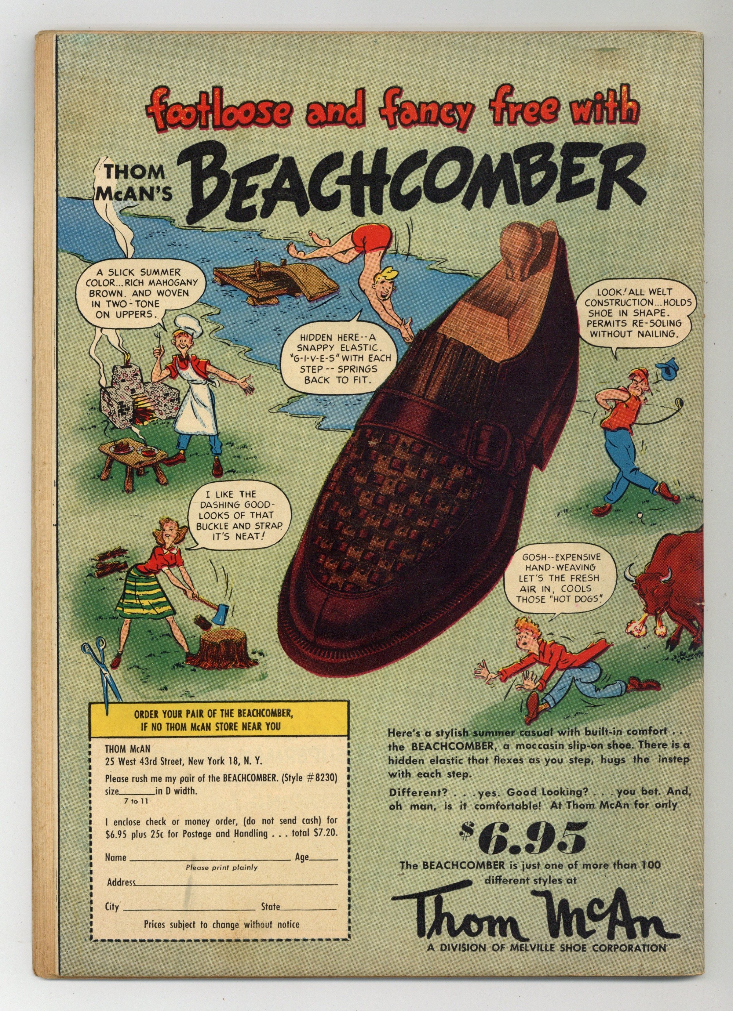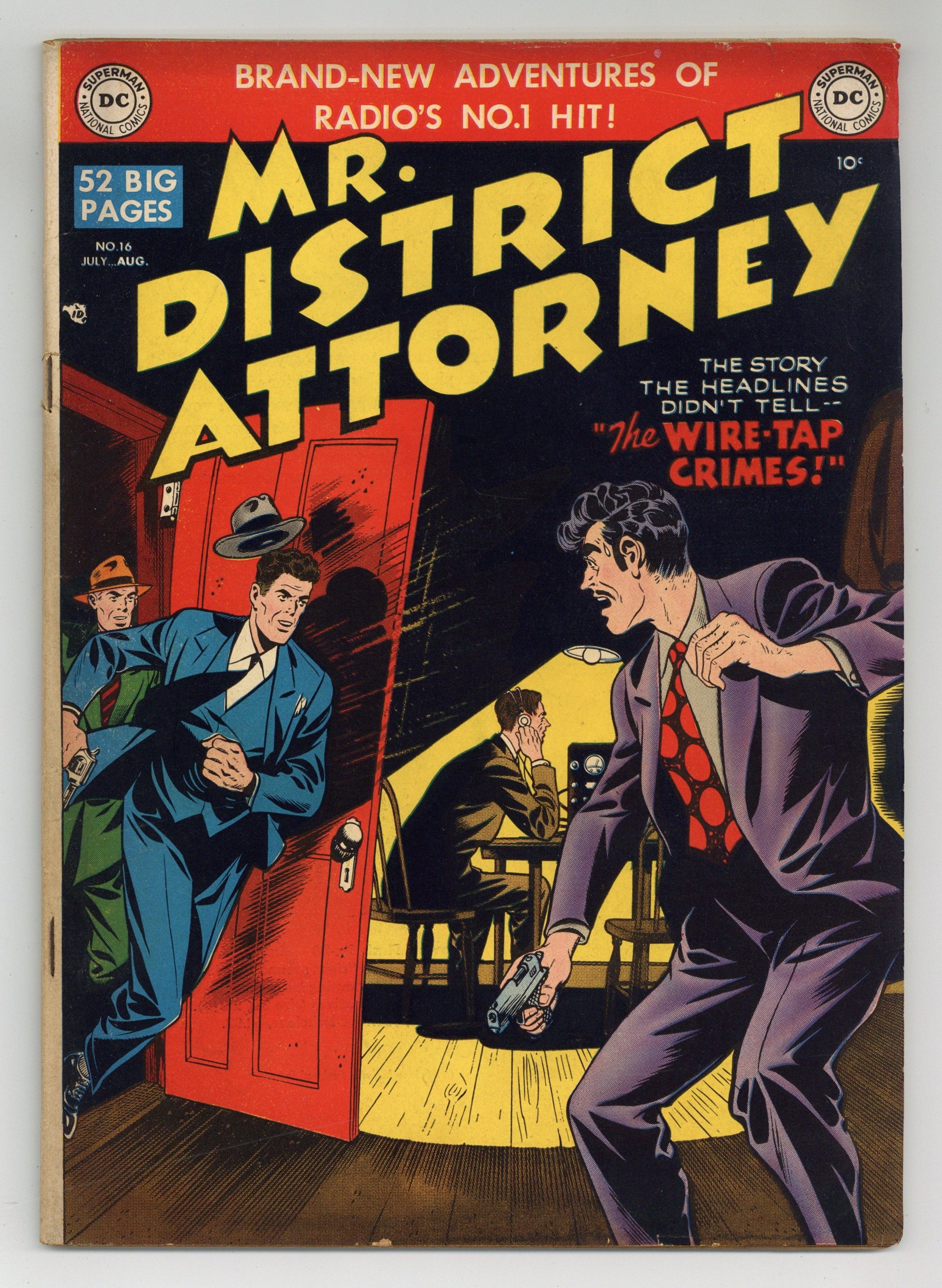 $34.00Cover by Howard Purcell and Charles Paris. Stories by Ed Herron, Henry Boltinoff, Stookie Allen and unknown. Art by Howard Purcell, Charles Paris, Stan Kaye, Leonard Starr, Tom Cooke, Henry Boltinoff and Stookie Allen. Brand-new adventures of radio's No. 1 hit! Mr. District Attorney in: "The Wire Tap Crimes!", the story the headlines didn't tell, with art by Howard Purcell and Charles Paris; "The Prisoner in the Muslin Mask!" with art by Purcell and Stan Kaye; and "The Crime Warden!" by Ed Herron, Purcell and Paris. Also in this issue: Casey the Cop 1-pager by Henry Boltinoff; "The Cop with the Deadshot Pencil!" with art by Leonard Starr; A Casebook Mystery "The Case of the Painter's Peril!" with art by Tom Cooke; The Crime File 2-page text article; and Grace Sullivan and Mary Sullivan "Like Mom!" half-pager by Stookie Allen. 48 pages, full color. Cover price $0.10.