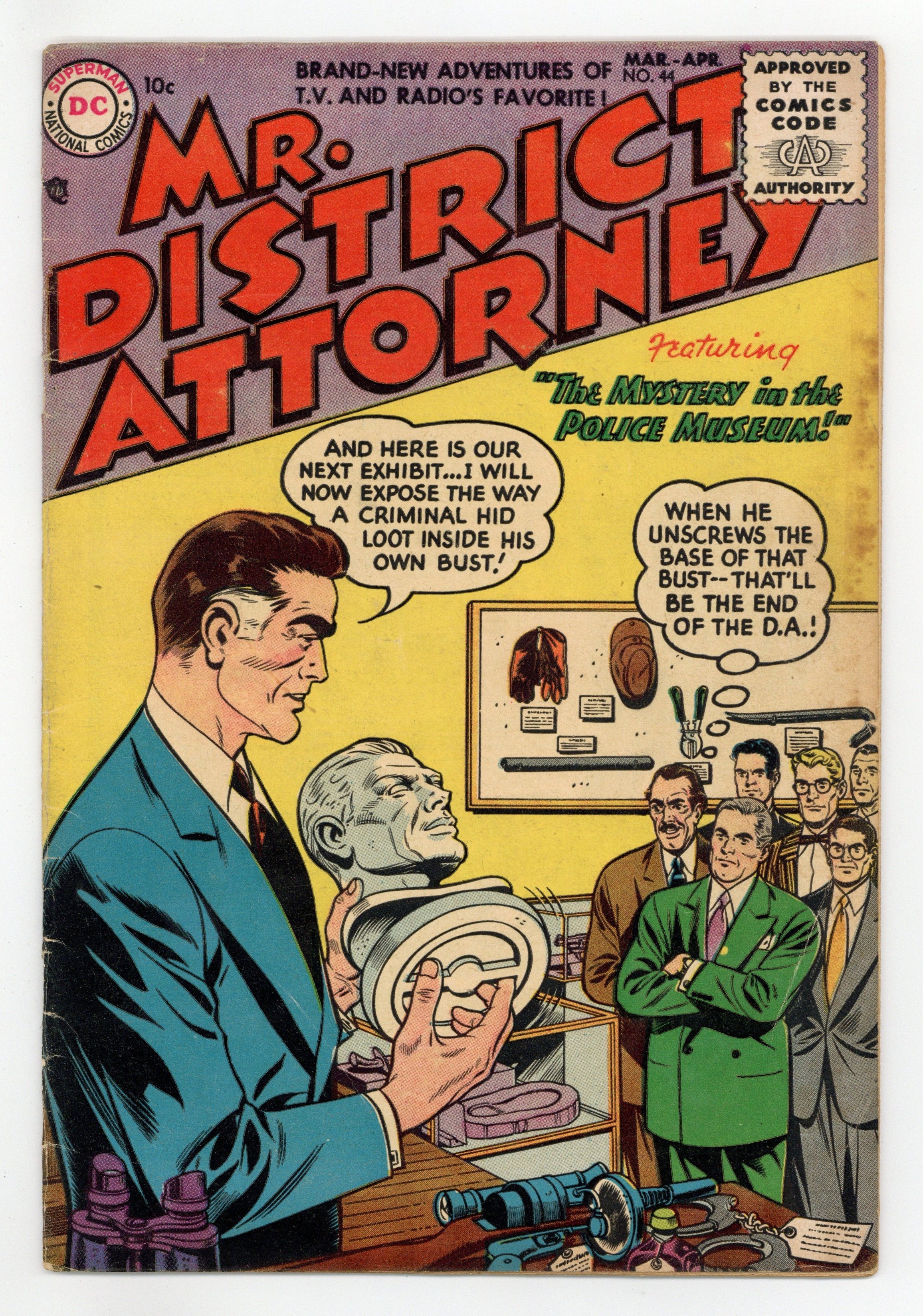 Cover by Curt Swan and Charles Paris. Stories by Henry Boltinoff, Morris Waldinger and unknown. Art by Howard Purcell, Charles Paris, Stan Kaye, Henry Boltinoff, Morris Waldinger and H.T. Elmo. Brand-new adventures of TV and radio's favorite! Mr. District Attorney in: "The S.S. Justice" with art by Howard Purcell and Charles Paris; "The Crooks with the X-Ray Eyes" with art by Purcell and Paris; and "Mystery in the Police Museum!" with art by Purcell and Stan Kaye. Also in this issue: Casey the Cop 1-pager by Henry Boltinoff, reprinted from All Funny Comics (1943) #22; "Notes on Forgery!" 1-pager by Morris Waldinger; Quick Quiz half-pager by H.T. Elmo; another Casey the Cop 1-pager by Boltinoff; and The D.A. File 2-page text article. 32 pages, full color. Cover price $0.10.