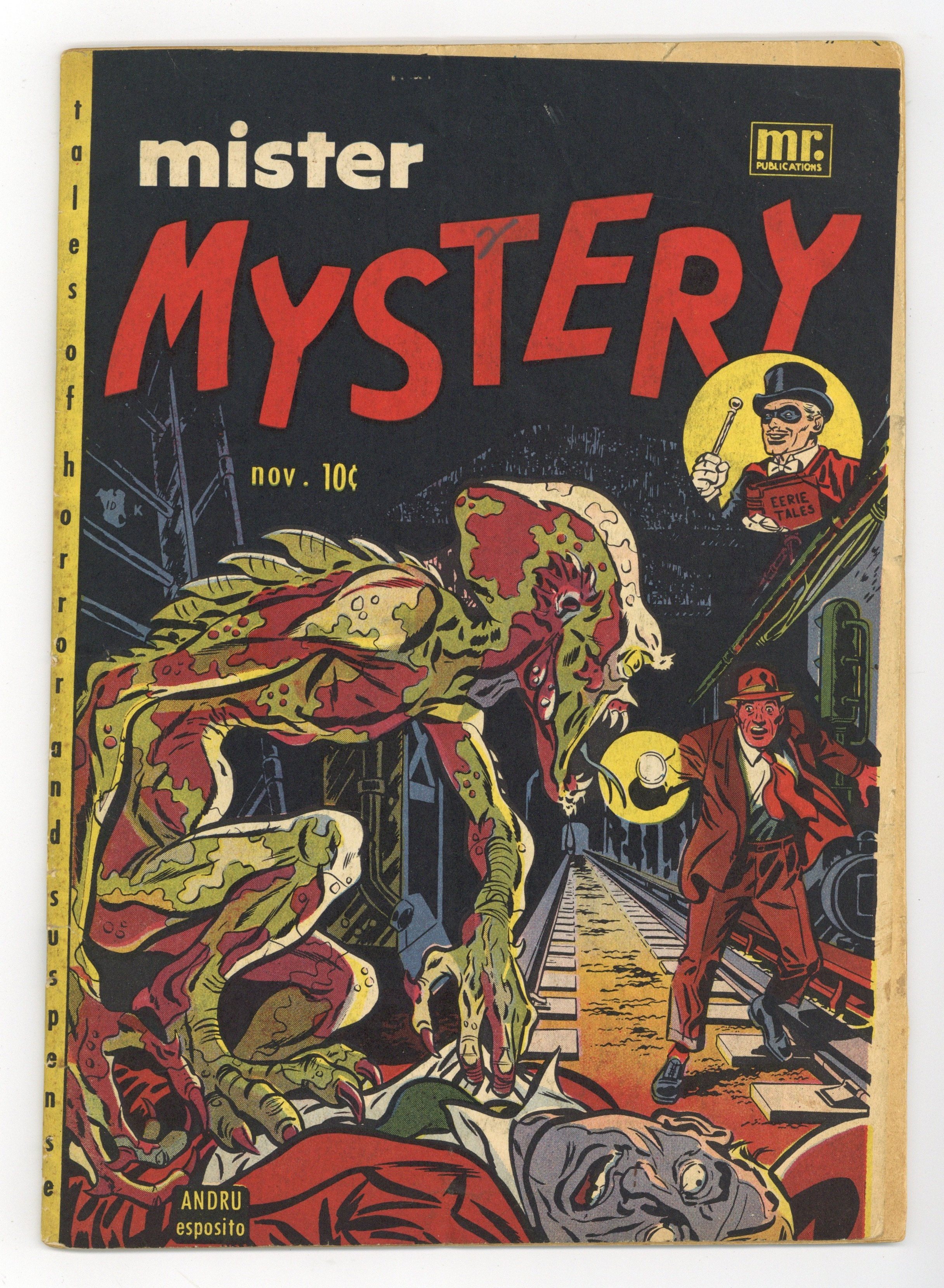 Pre-code horror. Cover pencils by Ross Andru, inks by Mike Esposito. The Subway Terror, art by Mike Esposito [as Mickey Demeo]; Patrolman Dave Whitley is transferred to "Department G", a secret police squad fighting a race of hideous and man-eating underground monsters terrorizing the subway. Imagination, art by Jack Abel; The boy Melvin seems to have an imaginary friend. Spectre of the Séance, art by Moe Marcus; A fake "Swami" rips off old ladies at séances. Ghosts...What About Them? text article. The Envelope, art by Charles Stern; A traveler gets into trouble presenting an envelope with a piece of paper; No one knows the meaning of the words written there, but they infuriate any reader. The Coffin, art by Tony Mortellaro. 36 pgs. $0.10. Cover price $0.10.