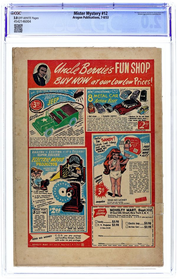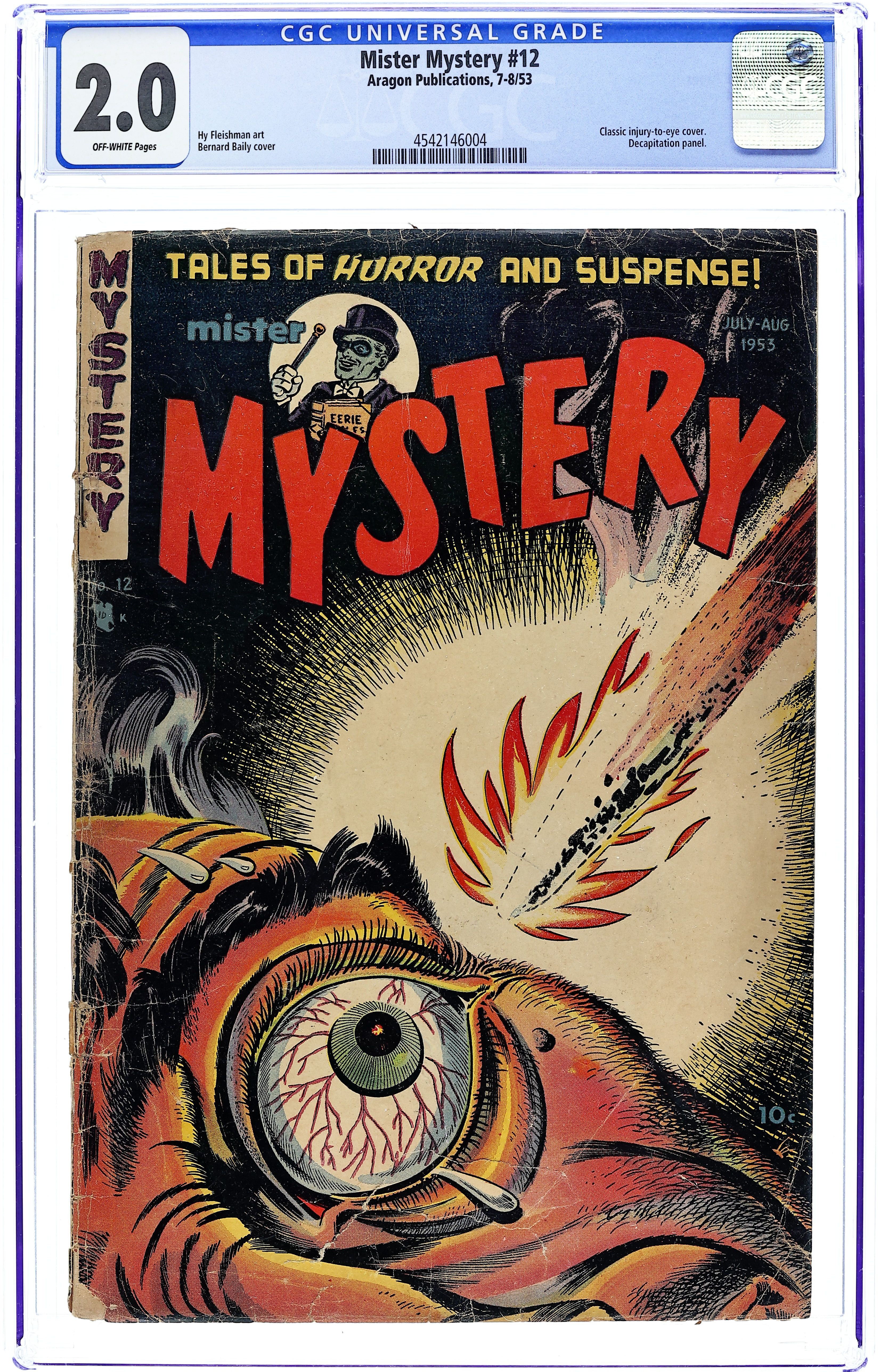 Cover by Bernard Baily. Stories and art by Hy Fleishman and others. Pre-Code horror tales from Aragon, an imprint of Stanley Morse Publications. Scientists seeking a subterranean paradise where people live forever instead find horrifying monsters. A man gets wishes from a genie and uses them for the perfect crime spree, but makes one wish too many, in a story featuring a pre-Code decapitation panel. Cover by Bernard Baily is the all-time classic "injury-to-the-eye motif" cover, a strange pre-Code horror trend. Shangri-La; Unknown Factor; The Curse of Aladdin; The Monster; The Trap. 32 pages, Full Color. Cover price $0.10.