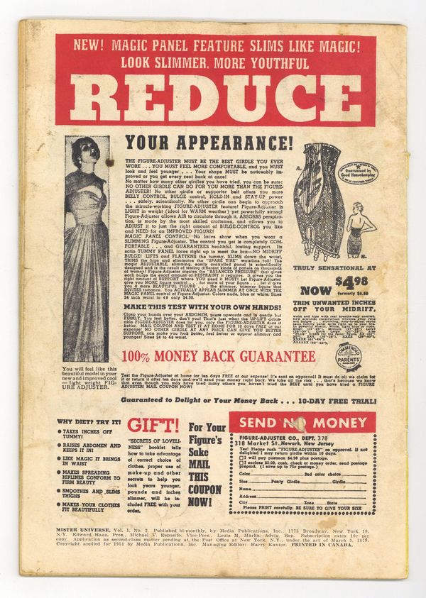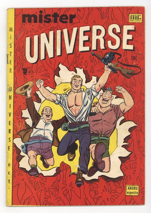 The Jungle That Time Forgot. Cover by Ross Andru and Mike Esposito. Stories and art by Ross Andru, Mike Esposito and Harry Kantor. The adventures of pro wrestler Mr. Universe was the only comic published by "Mr. Publishing," an imprint of Stanley Morse publishing. In an issue-length story, Mr. Universe and pals Jeff and Scarcely Able find a lost city in the jungle where the natives hail Mr. U. as "The Golden One" and fear the prehistoric flying beasts they call "The Terrible Ones." Art and cover by future Marvel artists Ross Andru and Mike Esposito. 32 pages, Full Color. Cover price $0.10.