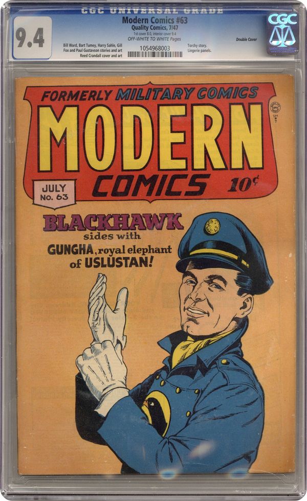 Cover art by Reed Crandall. Gungha the Royal Elephant of Uslustan starring Blackhawk, pencils by Crandall, inks by Chuck Cuidera. Untitled stories starring Torchy (script and art by Bill Ward), Dogtag (script and art by Bart Tumey), Ezra (script and art by Harry Sahle), Choo Choo (script and art by Gill Fox), and Will Bragg (script and art by Paul Gustavson). 52 pgs. $0.10. Cover price $0.10.