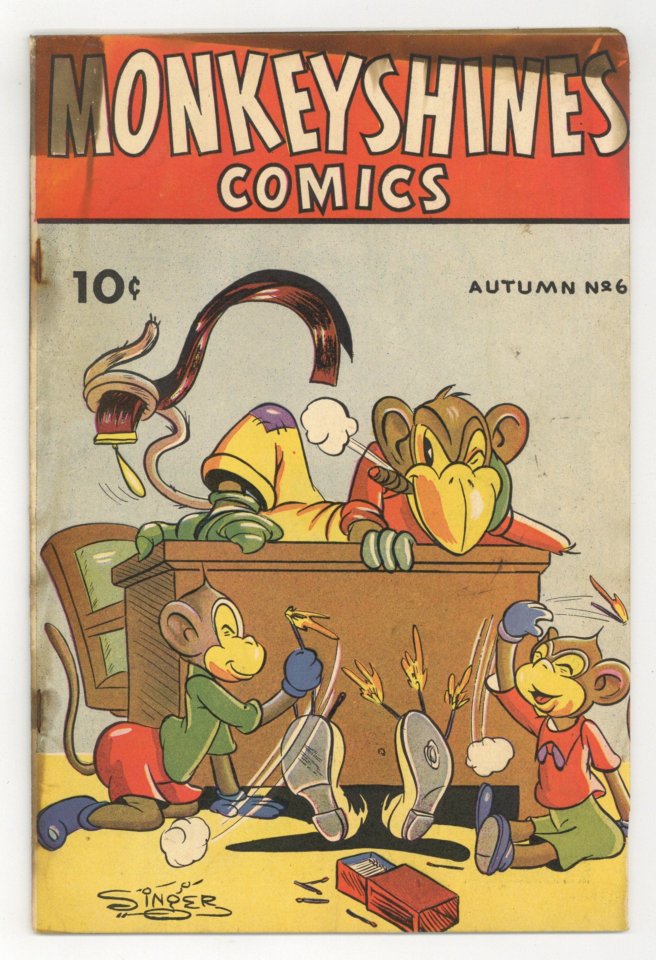 Sam Singer cover. Contains funny animal stories. In order of appearance: "Marmy the Monk"; "Nutty the Squirrel"; "Pete the Peke"; "Carrottop Cabot, The Rhyming Rabbit"; "Tuffy Bear"; and "An Aesop Fable, The Birds, The Beasts, and The Bat". "The Monkeyshine's Musicians" text story by Joe Blair. 36 pages. Full color. Cover price $0.10.