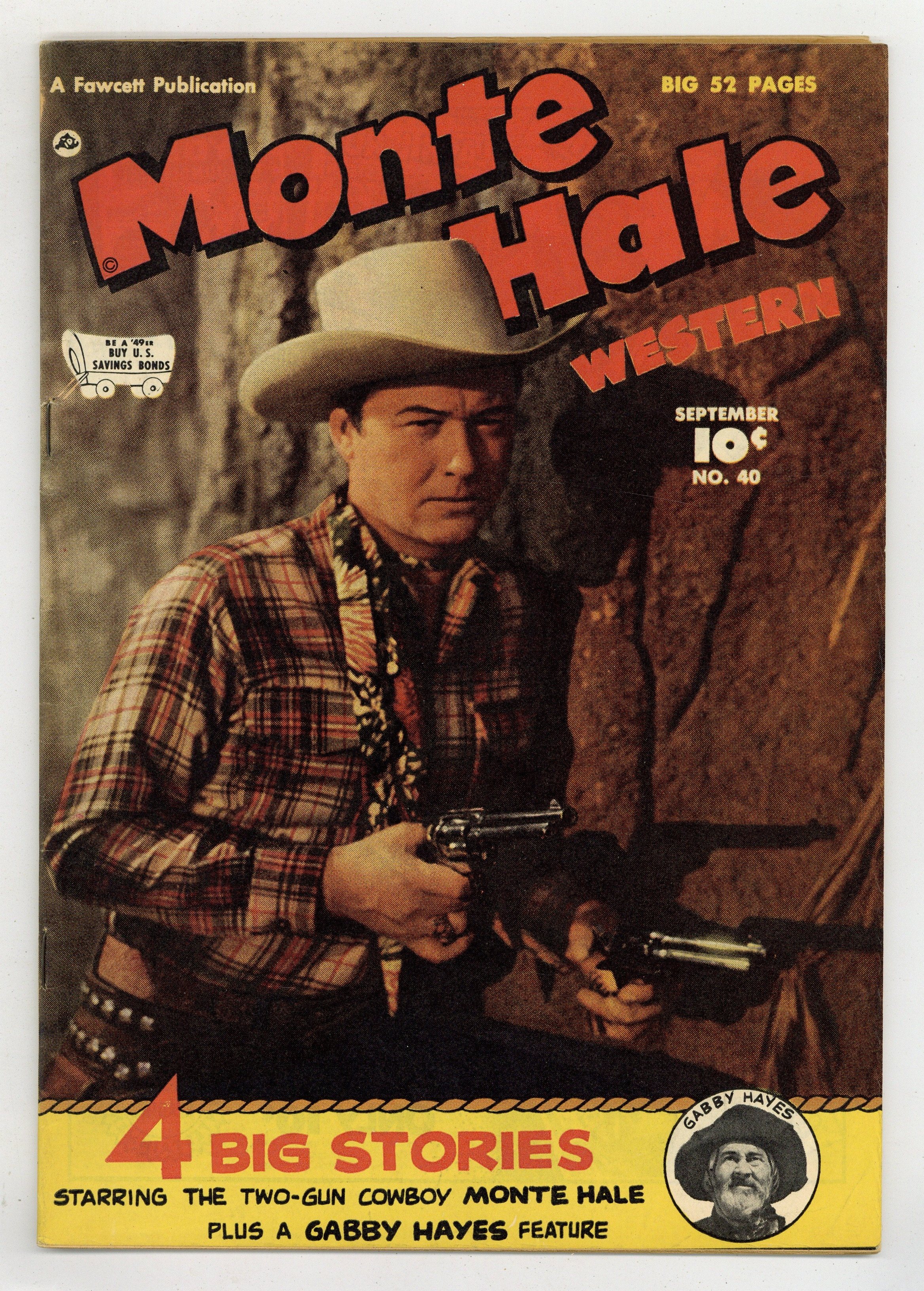 Stories and art by Bill Woolfolk and others. Movie cowboy Monte Hale wanders the frontier, cleaning up the West one outlaw at a time. When Monte investigates an abandoned mine that suddenly starts producing gold, he runs into his old enemy The Gravedigger. Monte pursues the mysterious "pirate train," a rogue locomotive (flying the Jolly Roger!) that makes raids on other trains. Monte faces the return of his old foe, the feral Wolfman. The Great Gold Strike; Bronko Betsy; Pirate Train!; Old Slick; Lamebrain Lem; Millionaire Roundup; Big Dreamer Bigglesberry; Gray Hawk: Mountain Ambush; Quicksand Haven; Blood Brothers; Gabby Hayes: Medicine Man; Return of the Wolfman. 48 pages, Full Color. Cover price $0.10.