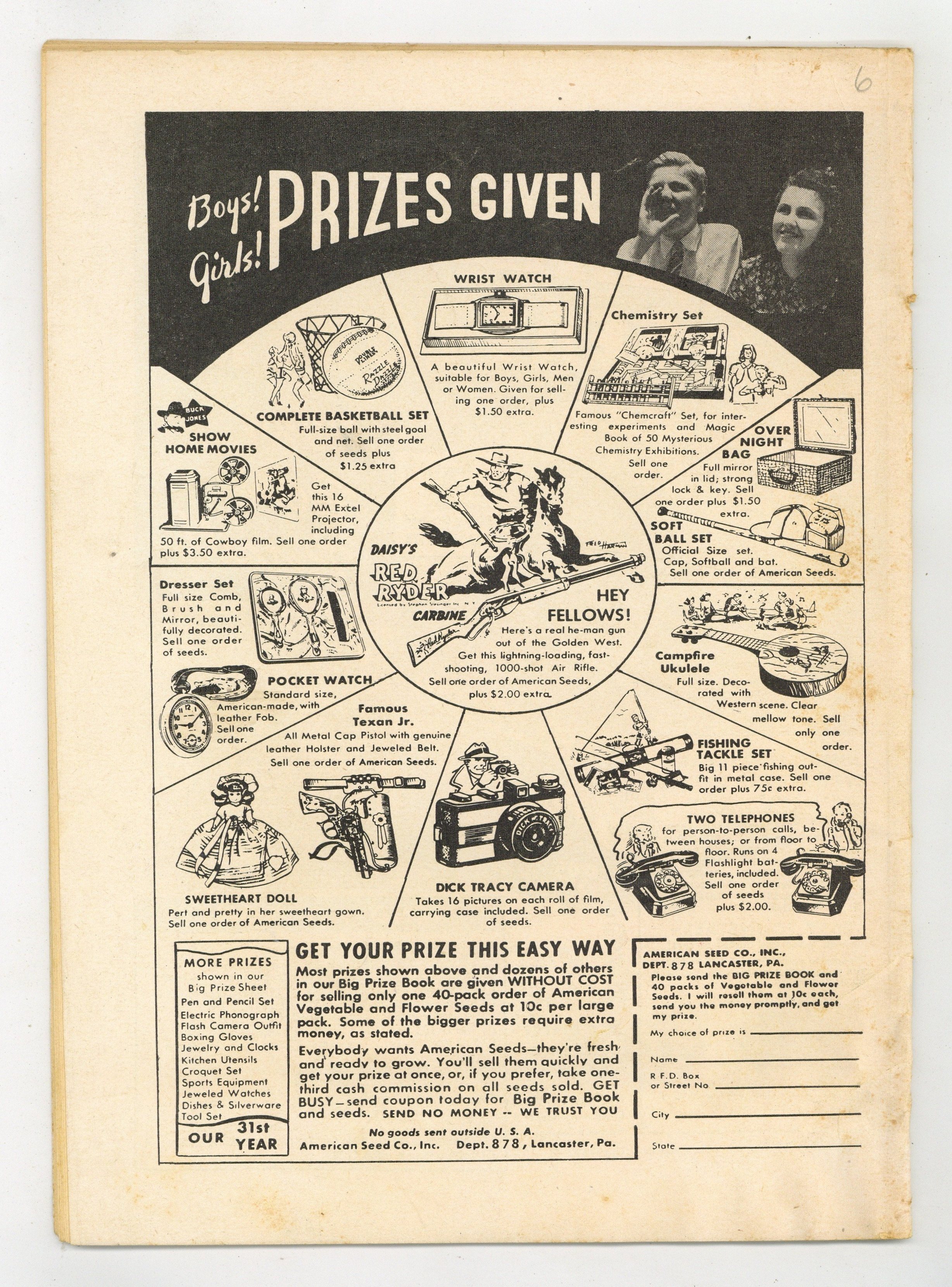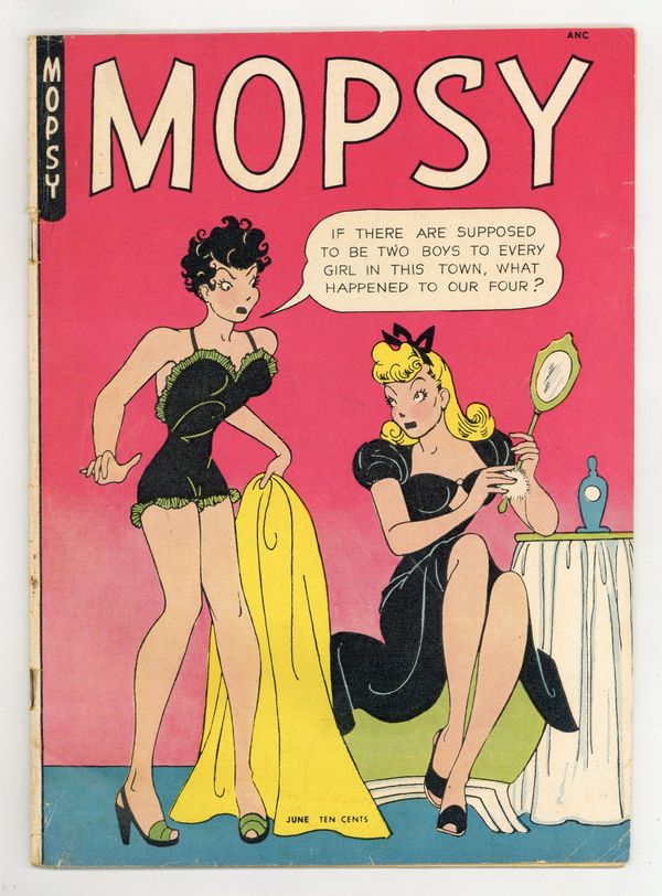 Cover by Gladys Parker. Stories and art by Gladys Parker and others. One of the first female-centric comic strips, by pioneering female artist Gladys Parker, Mopsy combines an Ever Meulen art style with pantomime-style gags and good-girl art. Mopsy sets her sights on Ken Walsh, a "determined" bachelor, but she winds up falling all over him - or is that her plan? Mopsy works a kissing booth, and keeps changing her prices depending on the men walking by. Johnny's tomfoolery threatens Mr. Burke's sale of a new chemical process. Plus "Mopsy Modes" paper dolls, showcasing the fashions of the era. Mopsy; Mopsy Modes; Johnny on the Spot: Trouble at the Doubles; Spring Fashions; A Loophole for Larry. 36 pages, Full Color. Cover price $0.10.