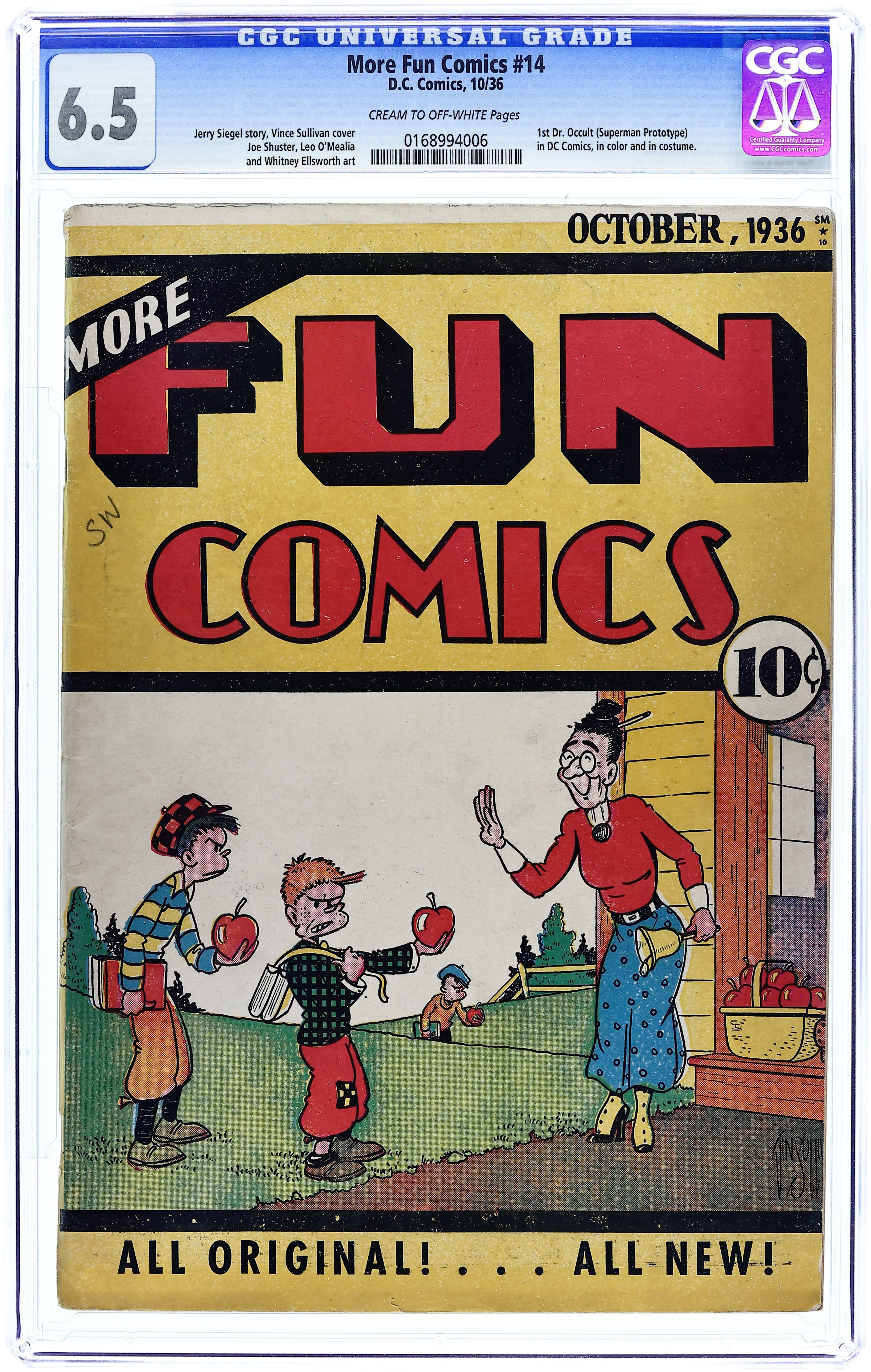 Issue 2 Vol. 2 changes to Issue 14. 1st Dr. Occult (Superman Prototype) in DC Comics, in color and in costume." Many collectors believe that More Fun Comics 14 includes the first ever origin of a superhero in a modern format comic book. The CGC label states "1st Dr. Occult (Superman Prototype) in DC Comics, in color and in costume". Cover price $0.10.