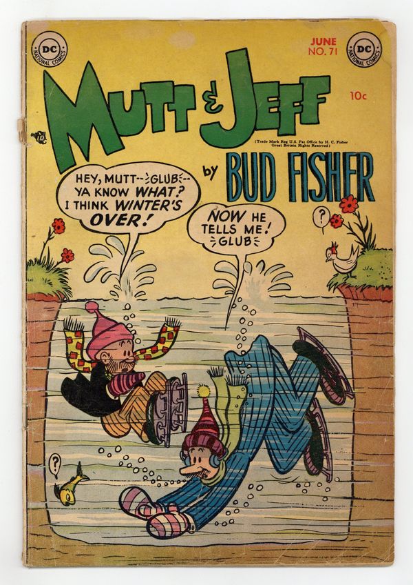 Cover by Sheldon Mayer (credited as Bud Fisher). Stories and art by Al Smith (credited as Bud Fisher), Henry Boltinoff, Jack Schiff, and Ruben Moreira. DC reprints the comic strip that defined the comic strip, featuring the original tall-and-short comedy duo. Also featuring the "topper" strip Cicero's Cat. Jeff becomes the proverbial traveling salesman. Jeff learns that he's a genius. Jeff gets a job at the bank, just in time for a bank robbery. Plus a PSA about acting your age. Mutt & Jeff; Cicero's Cat; Binky Says: Act Your Age!; Taffrail Talk; Varsity Vic; Time Out to Grin. 32 pages, Full Color. Cover price $0.10.