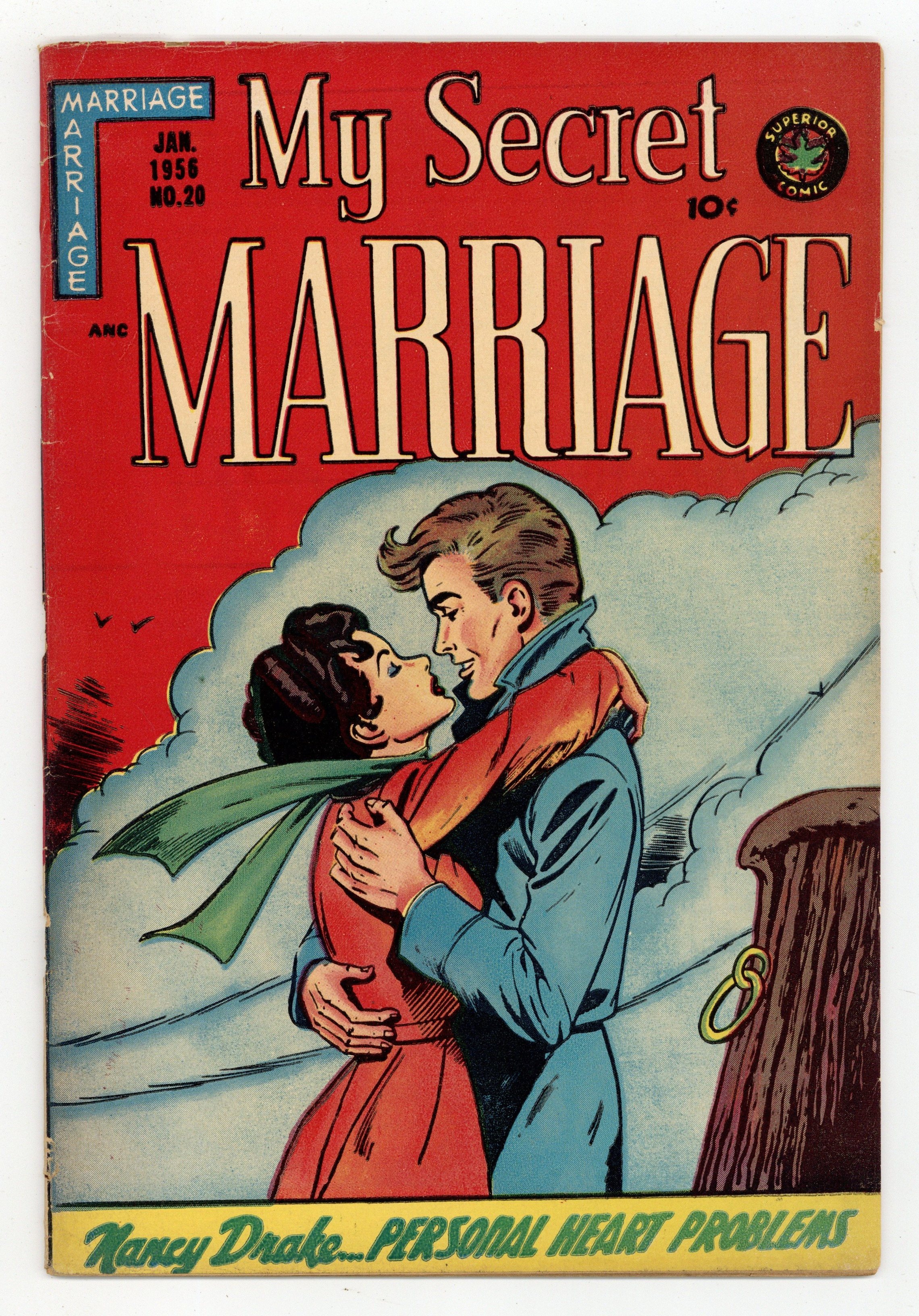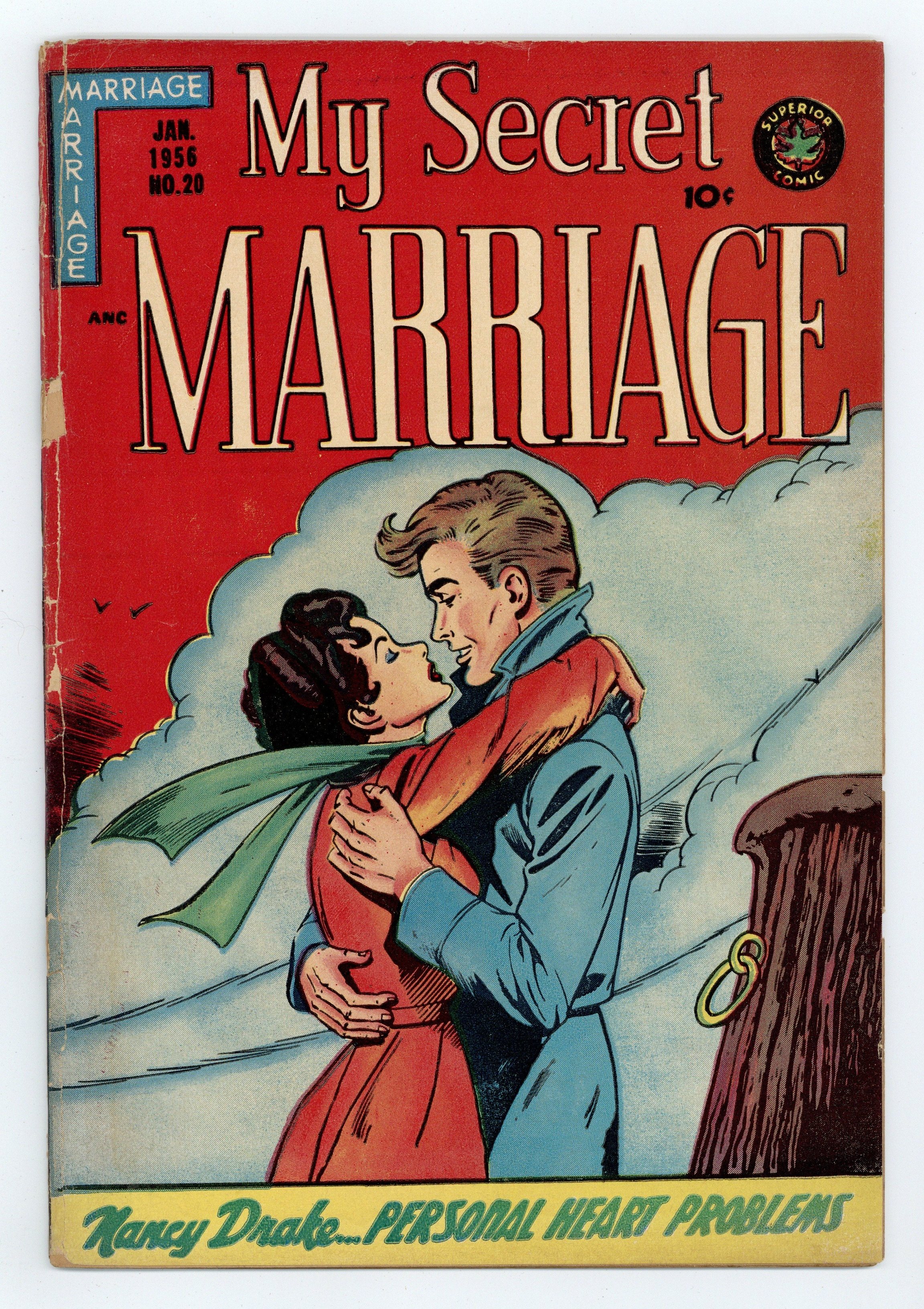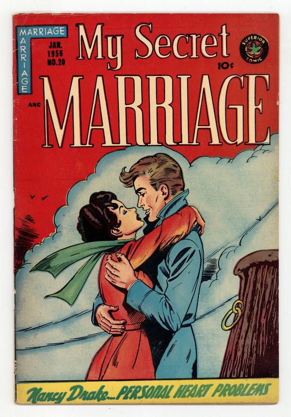 Couples wrestle with marital strife in this pre-Code romance comic from Canadian publisher Superior that often features good-girl art. Lois is torn between soldier Larry and defense contractor Jeff - but the story takes a left turn with the discovery of a spy ring. Sisters Betsy and Ellen get into a feud over dating older men, but one of the sisters is secretly married to boot. Bert discovers that his new wife Mary has inherited her father's gambling problem. My Cheating Heart; Two Kinds of Love; Too Young For Kisses; Gamble With Marriage. 32 pages, Full Color. Cover price $0.10.