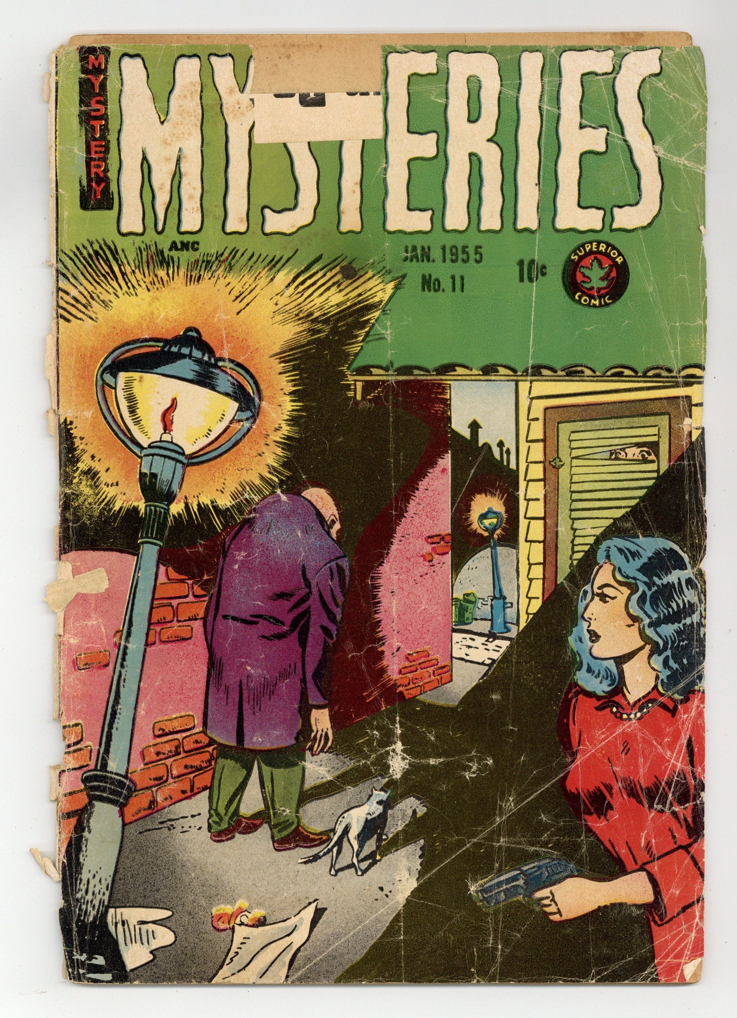 Pre-Code mystery and horror stories from Canadian publisher Superior. Beautiful ballerina Glenda goes to plastic surgeon Doctor Hill, unaware that he's obsessed with her and has plans for her face. Thieves discover the horrifying secret of hunchback Jonas Palmer, but by then it's too late. A woman investigates the bizarre secret behind a corpse that goes wandering from taxi to train to luxury cruise ship. The Broken Mirror; Midnight Prowler; Grim Wedding Day; The Wandering Corpse; Gypsys Curse. Final issue of the series. 36 pages, Full Color. Cover price $0.10.
