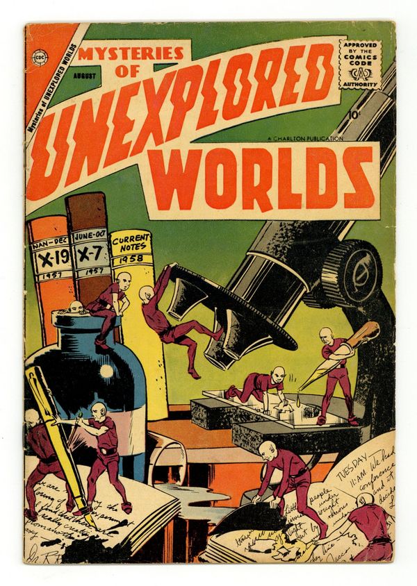 Cover by Steve Ditko. Stories and art by Steve Ditko, Bill Molno, Vince Alascia and Rocco "Rocke" Mastroserio. Charlton's popular series features tales of science fiction and fantasy with twist endings. A photographer accidentally stumbles on the FBI's extra special agents, in a story with art by Spider-Man co-creator Steve Ditko. Earth forces ill-advisedly fire a nuclear missile at a strange outer-space probe. Toomrah the Prophet is rejected by his followers for his visions of doom, but maybe he was right after all. Fluke; Waiting for Midnight; The Upside Down Spurs; Can This Be Real?; Toomrah the Prophet. 32 pages, Full Color. Cover price $0.10.