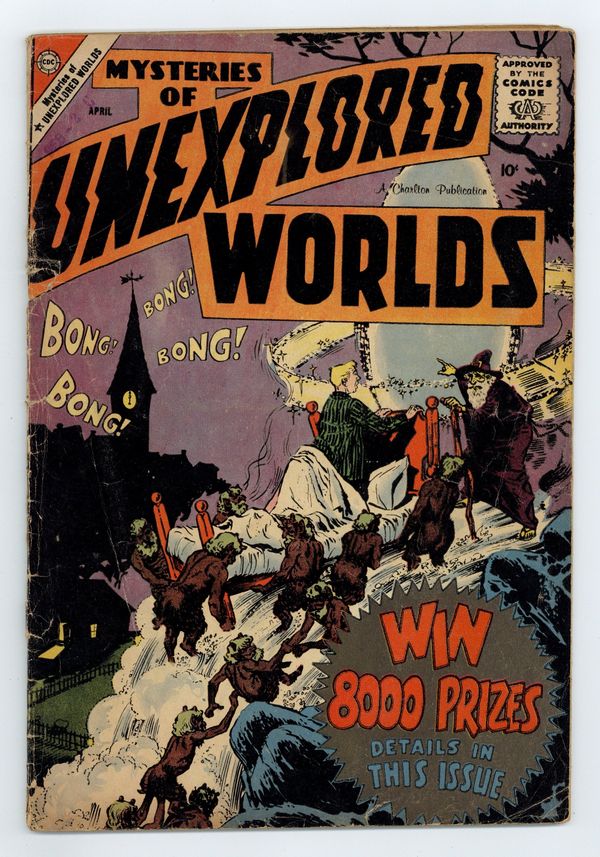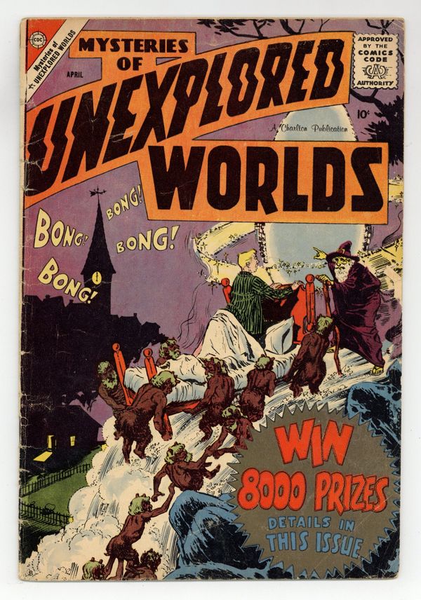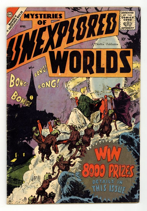 Cover by Steve Ditko. Stories and art by Steve Ditko, Matt Baker, Vince Colletta, Charles Nicholas, Vince Alascia, and Ernie Hart. Charlton's popular series features tales of science fiction and fantasy with twist endings. A run-down house cheers up a distraught couple, and vice versa, in a story with art by Spider-Man co-creator Steve Ditko. In another Ditko story that reflects its Cold War origins, deadly machines produce the weapons of war in a future world that doesn't need them. Lou gets Flo a magical charm bracelet from one of those magical sidewalk vendors, but it only does good if your intentions are good, in a story with art by good-girl art legend Matt Baker. The Water Stealers; Automata Ultima; The House That Cheered Up; A Lost Dimension; The Charm Bracelet. 32 pages, Full Color. Cover price $0.10.