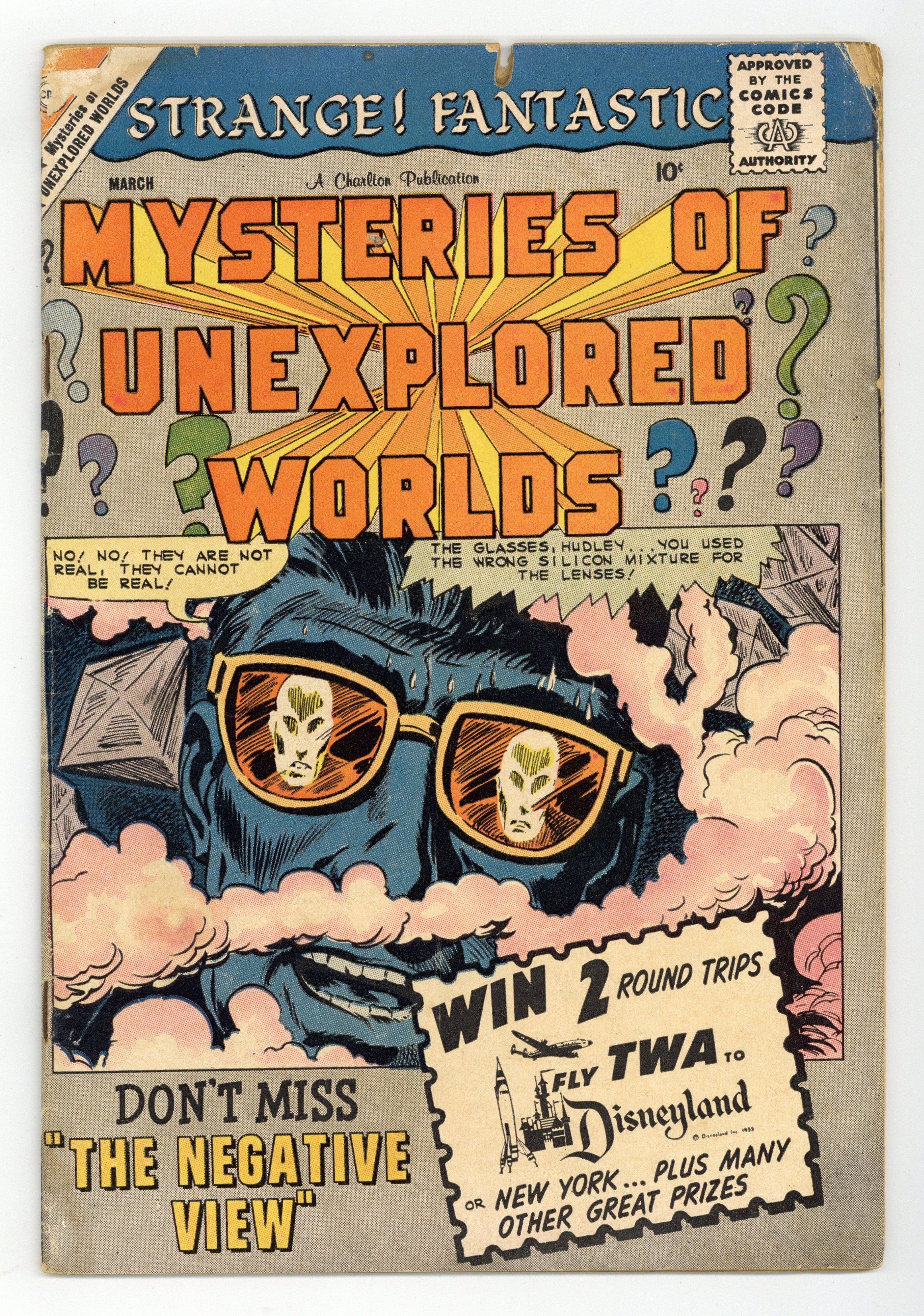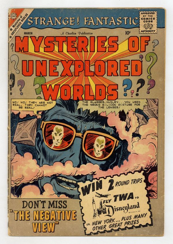 Cover by Bill Molno and Vince Alascia. Stories and art by Vince Alascia and Bill Molno, plus a spot illustration by Steve Ditko. Charlton's popular series features tales of science fiction and fantasy with twist endings. After a meteor strike, a teen befriends a visitor who has strange knowledge of the future. Special glasses allow a scientist to see smoky aliens from another dimension. On a mysterious island that seems to have no connection to the modern world, a sailor rescues a woman from pirates. Plus a text story with an illustration by Spider-Man co-creator Steve Ditko. The Stranger; The Negative View; The Strange Island; Proud; Come! See the Flying Saucer! 32 pages, Full Color. Cover price $0.10.