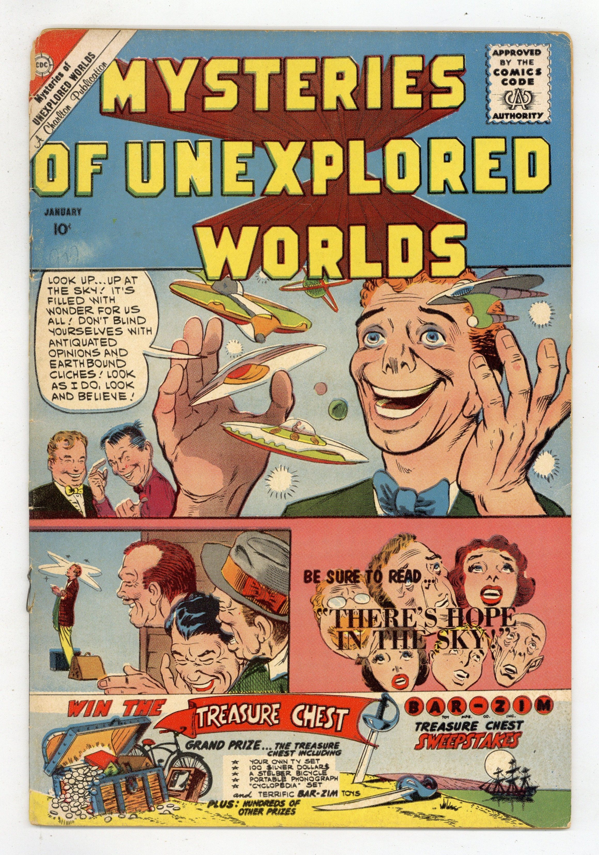 Cover by Steve Ditko. Stories and art by Steve Ditko, Rocco "Rocke" Mastroserio, Vince Alascia and Bill Molno. Charlton's popular series features tales of science fiction and fantasy with twist endings. Everyone laughs when a man claims that hope for humanity exists in the sky, in a story with art by Spider-Man co-creator Steve Ditko. A couple discovers the strange secret of the creepy funhouse at the Dreamland carnival. Oscar finds a strange ring that causes people to be afraid of him. The Fun House; Ring of Fear; There's Hope in the Sky; Try This Tennis; The Man Who Hated the World. 32 pages, Full Color. Cover price $0.10.