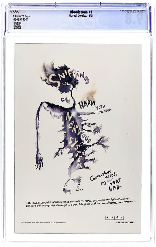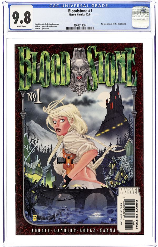 $65.00Blood Runs Thicker... - Written by Dan Abnett and Andy Lanning. Art by Michael Lopez and Scott Hanna. Cover by Michael Lopez. 1st appearance of Elsa Bloodstone. Growing up was tough for Elsa. Her mom was a nerdy archaeologist, she was constantly moving from place to place searching for the next ancient wonder, and she never knew anything about her father...until today! What do you do when you discover that your dad was the legendary monster hunter, Ulysses Bloodstone...and that he died doing what he loved best? You take up the mantle and kick some major monster butt...without your mom finding out, of course! Fans of Indiana Jones, Lara Croft or Buffy will definitely dig the hot hero called Bloodstone! With Dan Abnett and Andy Lanning providing the never-rest-for-a-moment story, and beautiful artwork by Michael Lopez and Scott Hanna, this adventure will be a light-hearted romp through the world of horror and the supernatural! And character design help from Alex Ross never hurts! 32 pages, full color. Cover price $2.99.