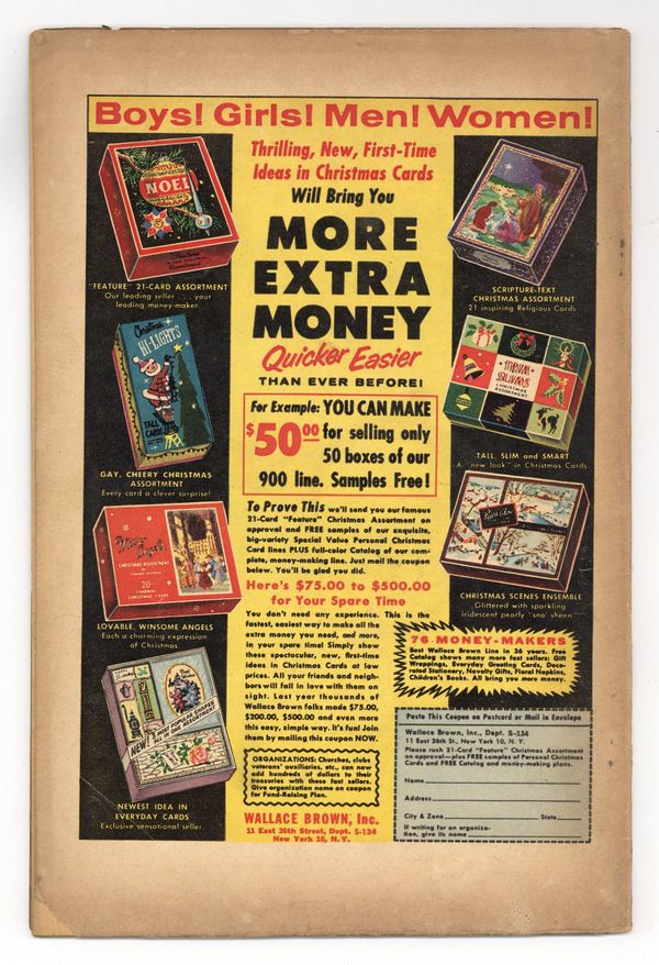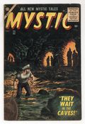 Cover art by Bill Everett. The Effigy, art by Wally Wood; A criminal takes an effigy from a voodoo cult so that they cannot use it to compel him to surrender himself to the police. Iron Face!, pencils by Bob Powell; When the communists come up with a machine that can read minds, NATO takes a short soldier and supplies him with a fake head that contains instructions for leading the commies into a trap. The Secret of the Iron Needle!, art by John Forte; Space explorers realize, when the planet they are examining runs down, the giant needle they've found is not a natural phenomenon but the winding key of a giant toy. The Last Laugh!, pencils by Pete Morisi; A ruthless businessman is sure that he is the reincarnation of someone important from medieval times, but when he does journey back into time he finds that he was...the court jester. Mystery Pupil text story. They Wait in the Caves!, art by Mort Drucker; A man finds an island abundant with pearls and gives the location to his friend. When the friend arrives, the natives destroy his boat to keep him from revealing the island's location to anyone else. The Land of Missing Persons. 36 pgs. $0.10. Cover price $0.10.