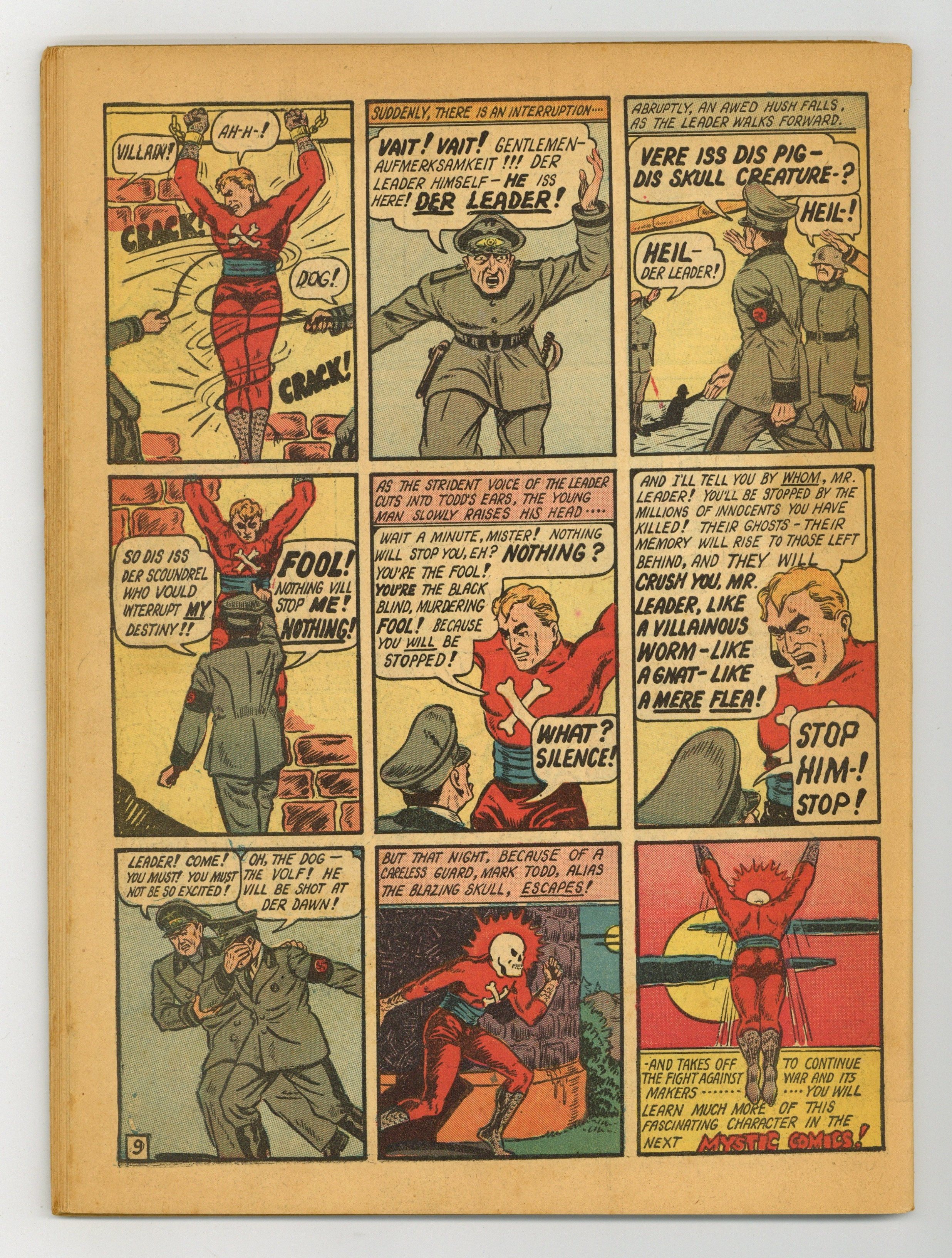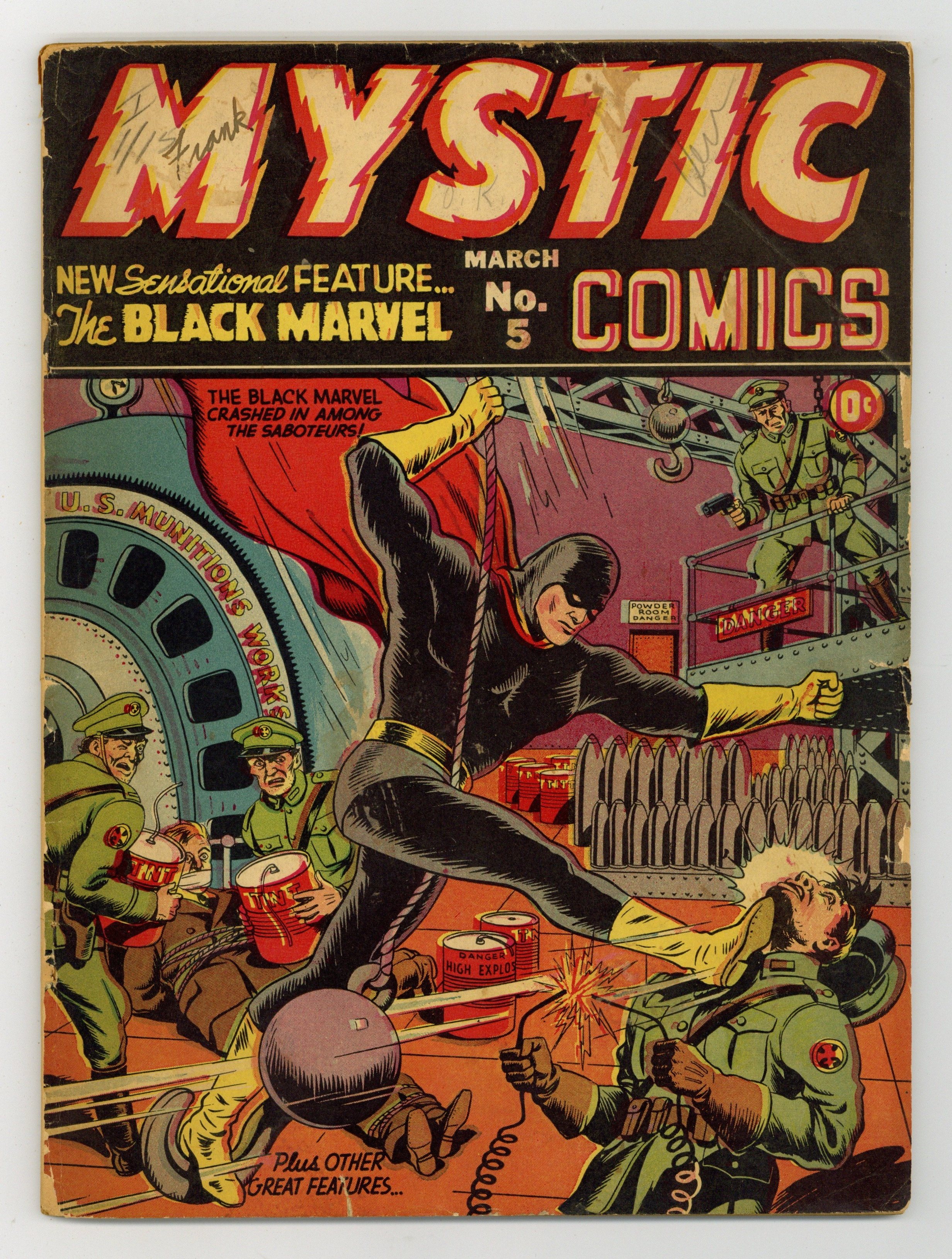 Cover art by Alex Schomburg. Captain America Comics #1 ad, pencils by Jack Kirby, inks by Joe Simon, Al Liederman, and Jack Kirby. The Origin of the Black Marvel, art by Al Gabriele; The Black Marvel stops a group of criminals who have sabotaged the power plant to provide cover to steal weapons to set themselves up as the local criminal power. The Tempest, art by Paul Gustavson; Cappy (an elderly fisherman) and his daughter Jane are shipwrecked on an island. The Discovery in the Volcano, art by Harold De Lay; Geologist Bob Roland and his fiancée Carol encounter the giant Sub-Earth Man and his Flame Men beneath a volcano. Introducing the Terror, pencils by Syd Shores; After witnessing an amazing transformation in his dog, brought on by chemicals, Dr. Storm extracts a serum to grant those powers of fearlessness and a skull-like appearance to a human being. Garvey Lang, script by George Kapitan, art by Harry Sahle; Satan asks the Black Widow to collect the soul of train robber Garvey Lang. The Poisoned Children, art by Fred Guardineer; The Moon-Man goes after a racketeer who bought tainted meat for an orphanage so he could pocket most of the money. The Story of Mark Todd, script and art by Bob Davis (as Mister X). 68 pgs. $0.10. Cover price $0.10.