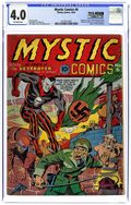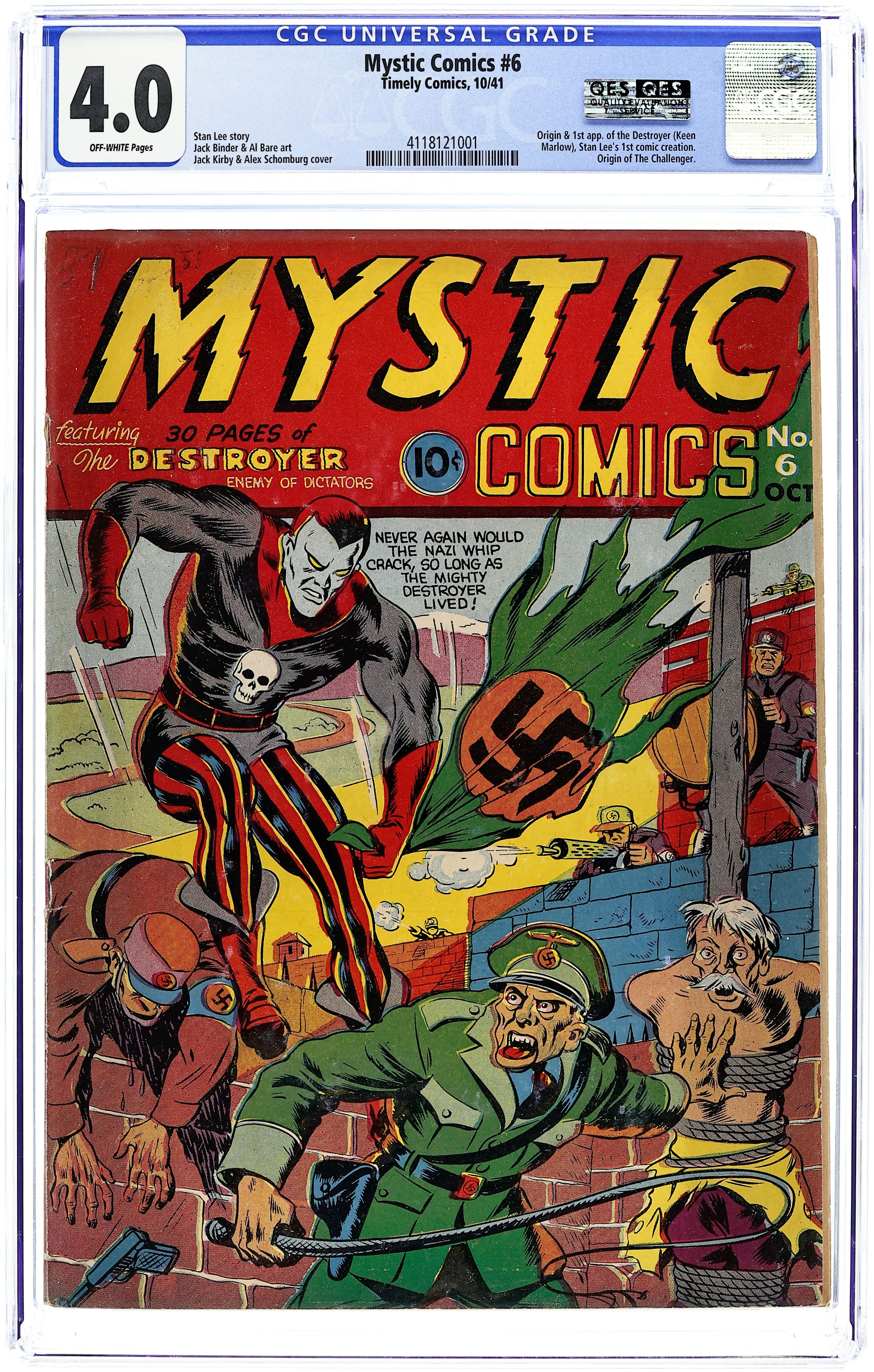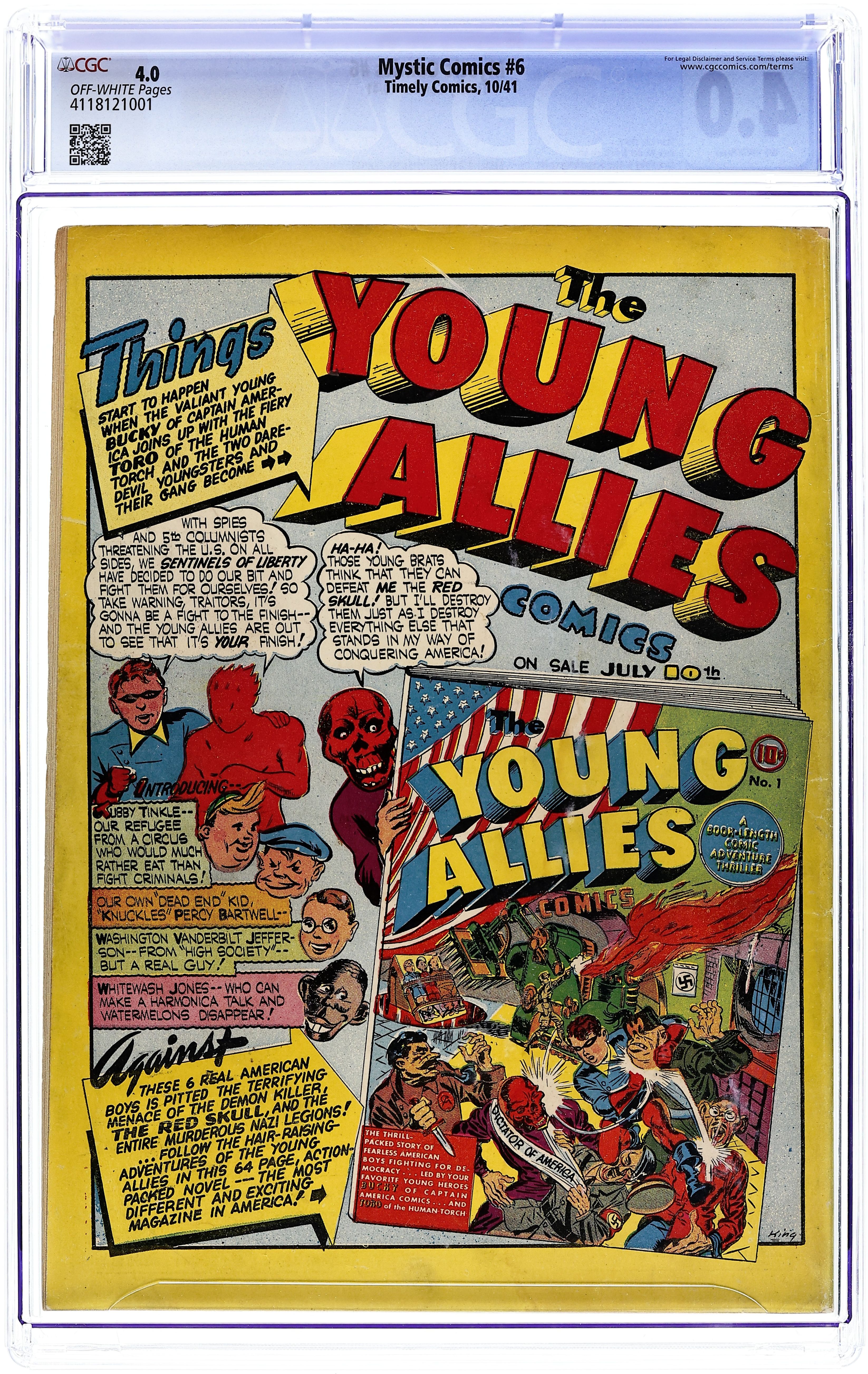 Cover art by Alex Schomburg. Ad for Captain America Comics and for joining Cap's Sentinels of Liberty, pencils by Joe Simon and Jack Kirby, inks by Joe Simon. Meet the Destroyer, art by Jack Binder; American reporter Keen Marlow is sent to Nazi Germany to report news other than what the government propaganda department releases. The Scar; he Scar, a Nazi scientist, uses his death ray on Germans protesting food rations. Identity Unknown; The Black Marvel's efforts to discover who killed a German scientist who had fled to the U.S. are complicated when one of his main suspects develops amnesia. Dolls of Death; When the miniaturized dead body of a general is delivered to the President as a doll, the Terror investigates the "Life-Like Doll Company" to prevent any more such bizarre murders. Choose Your Weapons!, art by Al Bare; The Challenger issues a challenge to a serial strangler to strangle him while he walks unprotected through the city on the night of the next full moon. Dark Streets of London, script and art by Bob Davis; The Blazing Skull is too late to stop German spies from informing their superiors of the Prime Minister's secret flight over their country, so he must go to Germany himself to stage a rescue. Young Allies Comics #1 ad. 68 pgs. $0.10. Cover price $0.10.