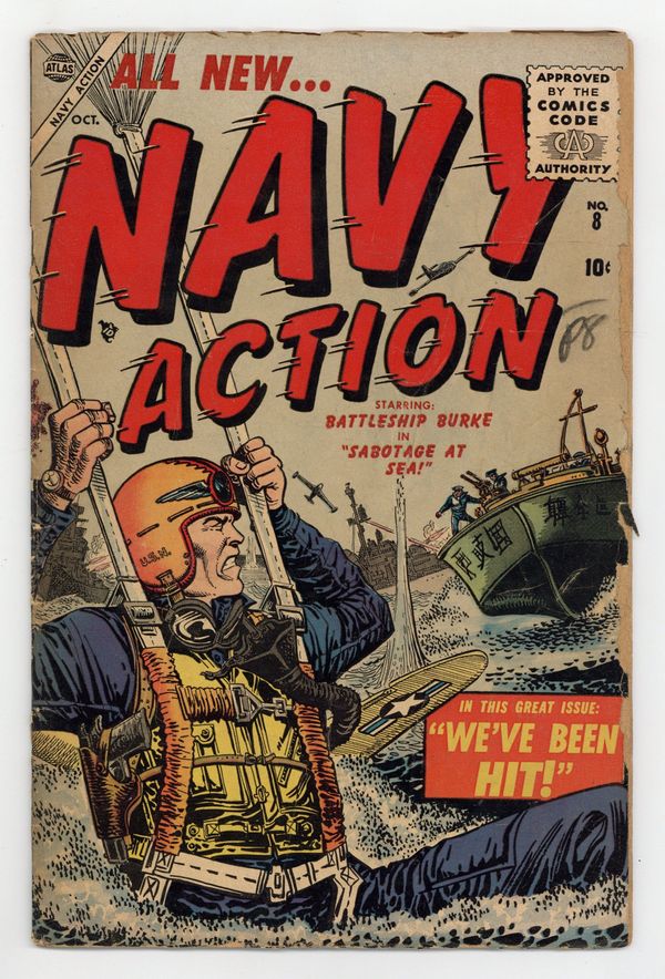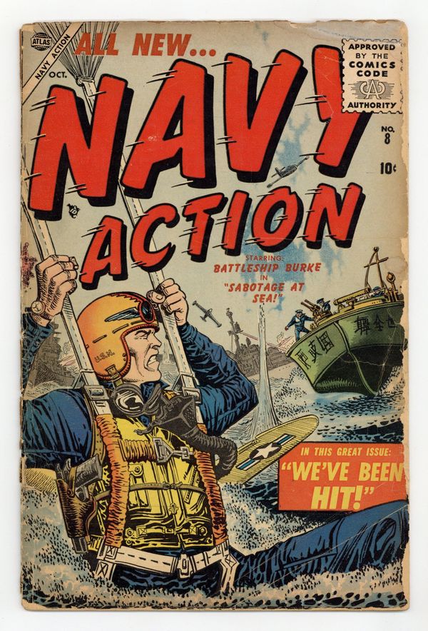 Battleship Burke in an untitled story (art by Joe Maneely), "We've Been Hit" (art by Mort Lawrence), "The Rockets Roar" (art by Gene Colan), "The Big Night," and a two-page text story, "The Great Defeat." Cover price $0.10.