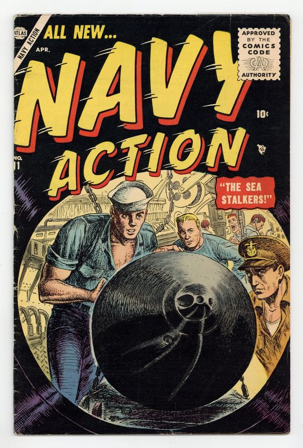 Battleship Burke in two stories, including "Two Sailors Against a Sub!" (art by Syd Shores); "Task Force" (art by Gene Colan), "Second Chance for Private Ruark!" (art by Paul Reinman), "The Sea Stalkers," and a two-page text story, "Sea Wolf." Joe Maneely cover. Title becomes Sailor Sweeney # 12-14. Cover price $0.10.