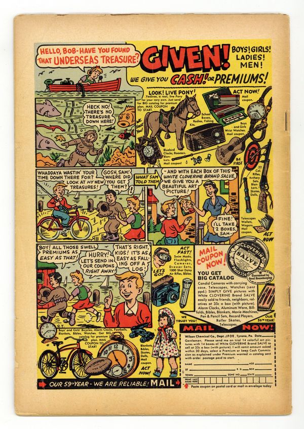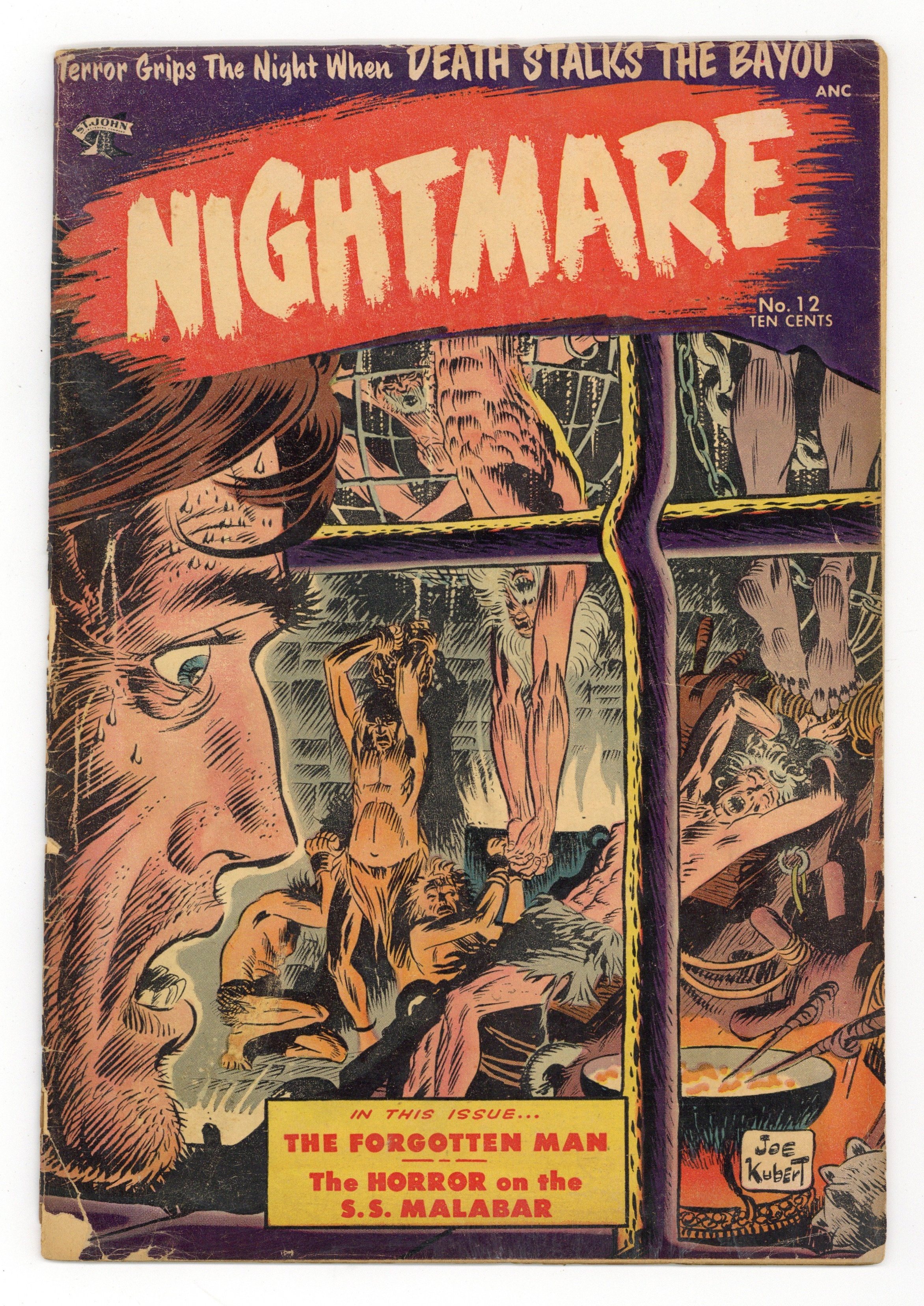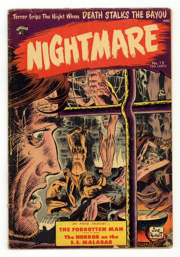 Cover by Joe Kubert. Stories and art by Enrico Bagnoli, Antonio Canale, and Edgar Allan Poe. Classic pre-Code horror from St. John. A man searches for the legendary lost city of San Miguel, where his love waits for him. A killer learns he shouldn't have abused a black cat, in an adaptation of a classic Edgar Allan Poe story. A couple's new coffee shop in an ancient house is haunted by a murder that replays every night. Bondage cover by comics legend Joe Kubert. Death Stalks the Bayou; The Black Cat; The Horror of the SS Malabar; The Face That Wasnt There; The Forgotten Room. 36 pages, Full Color. Cover price $0.10.