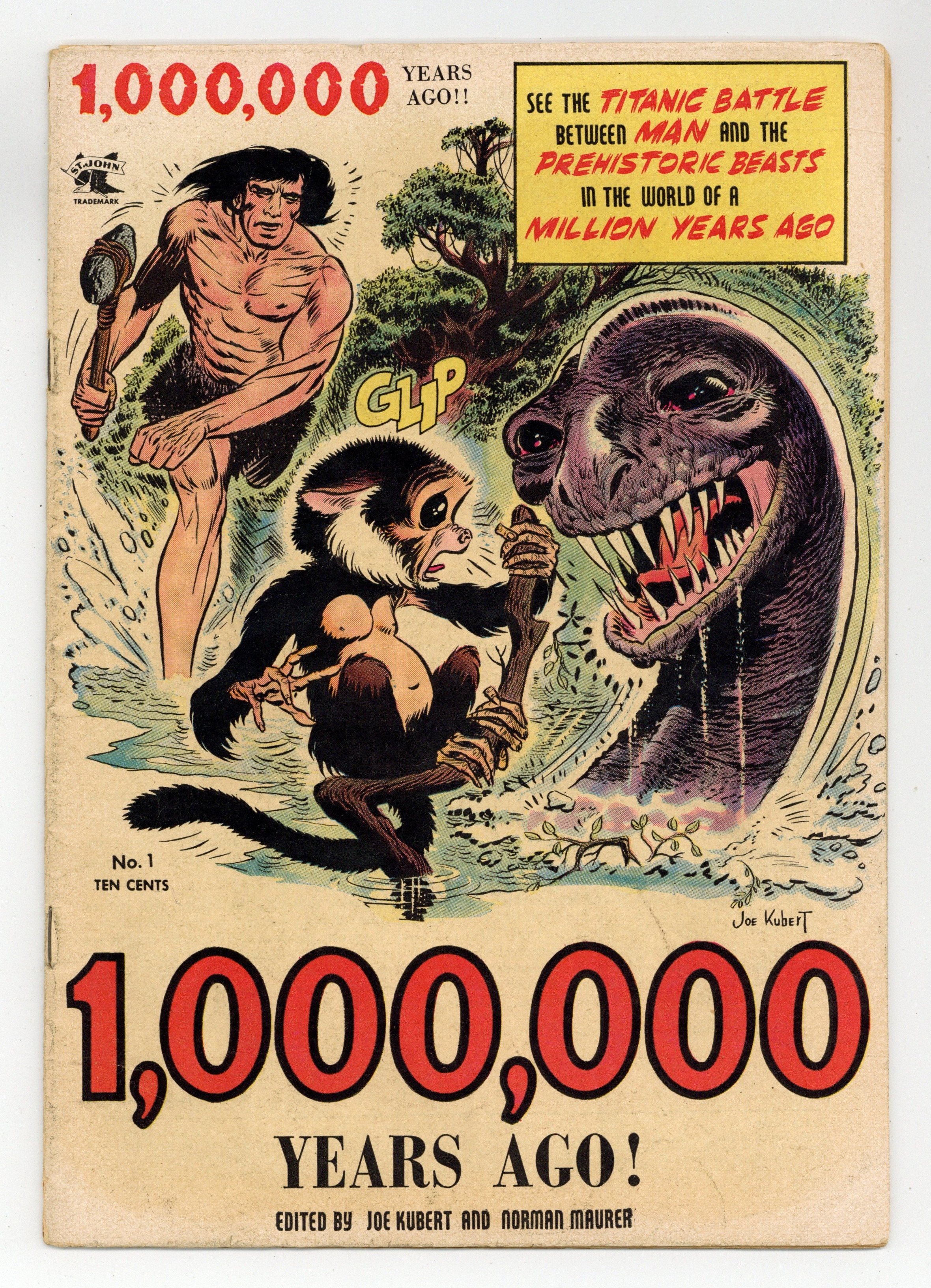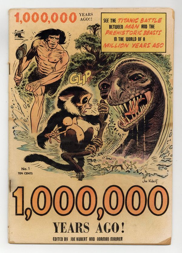 Cover by Joe Kubert. Stories and art by Joe Kubert and Norman Maurer. Comics legend Joe Kubert won fans early in his career with his tales of Tor, a caveman struggling for survival in a world where humans co-exist with dinosaurs. Co-creators Joe Kubert and Norman Maurer put themselves into the comic, to introduce Tor and his world. Tor rescues a friend while hunting, in a story that reveals how he met his pet Chee-Chee. The Wizard of Ugghh tries to teach magic to Klukk, son of Dripp. While visiting the museum, Danny falls asleep and dreams himself into his own caveman adventures. Tor; Chee-Chee's Glossary; 1,000,000 B.C. History of Prehistoric Animals: Man, Stegosaurus, Tyrannosaurus; Wizard of Ugghh; Underworld; Danny Dreams. Final issue under this title; Tor's adventures continue in 3-D Comics Tor (1953 St. John). 32 pages, Full Color. Cover price $0.10.