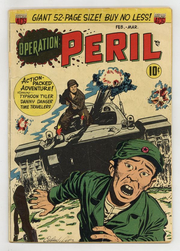 Cover by Ogden Whitney. Edited by Richard E. Hughes. Stories by Richard Hughes. Art by Ogden Whitney, Ken Bald, and Leonard Starr. Tales of adventure and science fiction from legendary early independent comics publisher ACG. A shrunken head in a museum tells its story of misadventure in the Amazon; To prove that their time machine works, Tom and Peggy travel to the time of King Arthur and return with his sword Excalibur; Danny Danger helps a playwrights secretary who has been targeted by gangster Fingers Feeley. Typhoon Tyler; River-Crossings Were Rough!; Time Travelers; The Thing that Talked; Madman's Jump; Blind Man's Bluff!; Danny Danger; Checkerboard Sheriff! 52 pages, Full Color. Cover price $0.10.