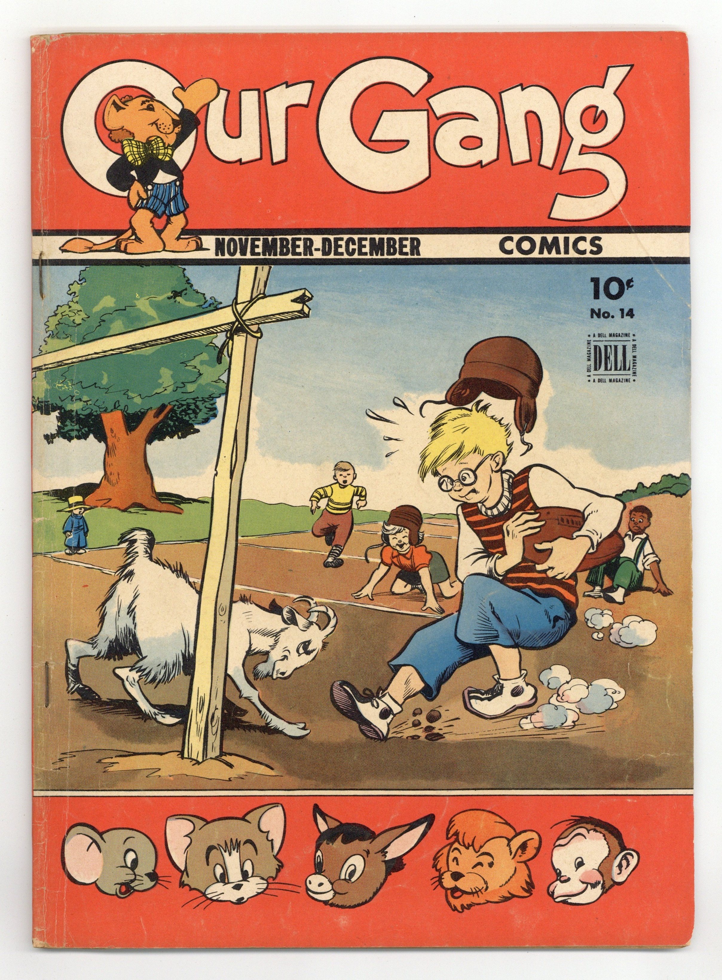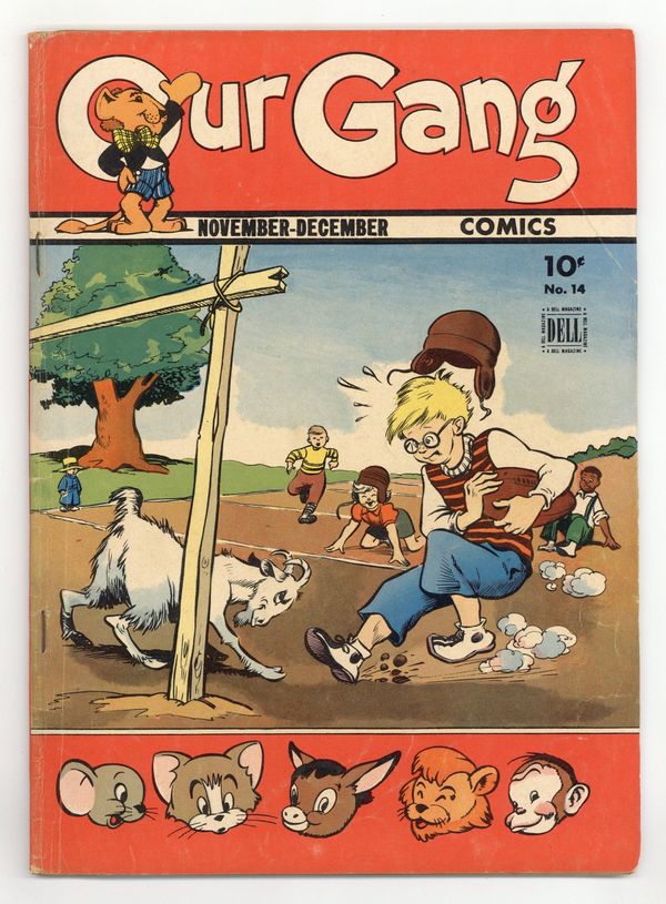 Starts Apr 4 Cover by Walt Kelly. Stories and art by Walt Kelly, Carl Barks, Gaylord Du Bois, Lloyd White and John Stanley. Based on the popular movie shorts also known as Little Rascals, Dell's Our Gang Comics featured early work by Pogo's Walt Kelly and other cartooning greats. In a story by Kelly, the gang accidentally runs across crooks who are counterfeiting WWII ration books. Barney Bear uses Benny Burro as bait to catch the wolf stealing his sheep, in an early story by legendary Uncle Scrooge creator Carl Barks. Jerry and Tuffy decide to go fishing in the goldfish bowl, in a story by John Stanley of Little Lulu fame. Plus a comics story featuring another Tex Avery creation, Skrewy Squirrel. Our Gang; Flip 'n' Dip; Tom and Jerry; Johnny Mole; Barney Bear and Benny Burro; Friends Indeed; Skrewy Squirrel. 48 pages, Full Color. Cover price $0.10.