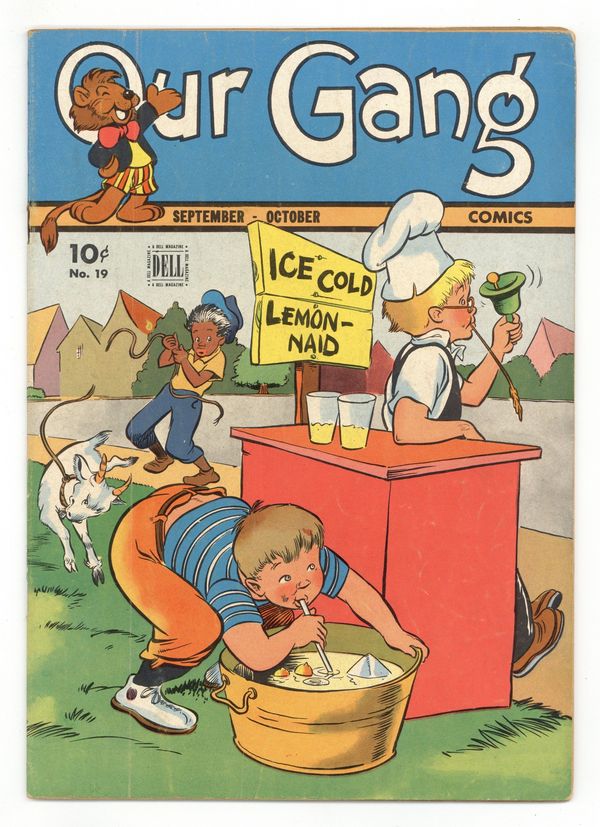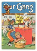 Cover by Walt Kelly. Stories and art by Walt Kelly, Carl Barks, Gaylord Du Bois, Dan Gormley, H. R. McBride and John Stanley. Based on the popular movie shorts also known as Little Rascals, Dell's Our Gang Comics featured early work by Pogo's Walt Kelly and other cartooning greats. In a story by Kelly, Janet decides to leave the gang and start her own gang with toddler Two by Two. Barney Bear goes fishing for turtle soup, but the turtle catches him instead, in an early story by legendary Uncle Scrooge creator Carl Barks. Jerry and Tuffy find a little girl mouse named Giggles, and Tuffy is ready to take her in, but Jerry smells trouble. Wuff Strikes It Rich!; Our Gang; Flip 'n' Dip; Tom and Jerry; Johnny Mole; Barney Bear and Benny Burro. 32 pages, Full Color. Cover price $0.10.