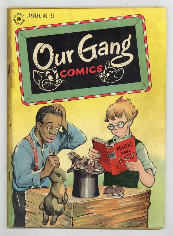 Cover by Walt Kelly. Stories and art by Walt Kelly and Carl Barks. Based on the popular movie shorts also known as Little Rascals, Dell's Our Gang Comics featured early work by Pogo's Walt Kelly and other cartooning greats. In a story by Kelly, Froggie gets the gang jobs delivering for the local drugstore, but their first job gets them captured by a mad scientist, who wants to use them to test his teleporter. Then they get involved in an escapade involving a runaway goat and escaped mice in Spinster Johnson's parlor. Barney and Benny have misadventures on the ski slopes, in an early story by legendary Uncle Scrooge creator Carl Barks. Musty Mouse; Our Gang; Flip 'n' Dip; Tom and Jerry; Johnny Mole; Barney Bear and Benny Burro; Wuff the Prairie Dog. 48 pages, Full Color. Cover price $0.10.