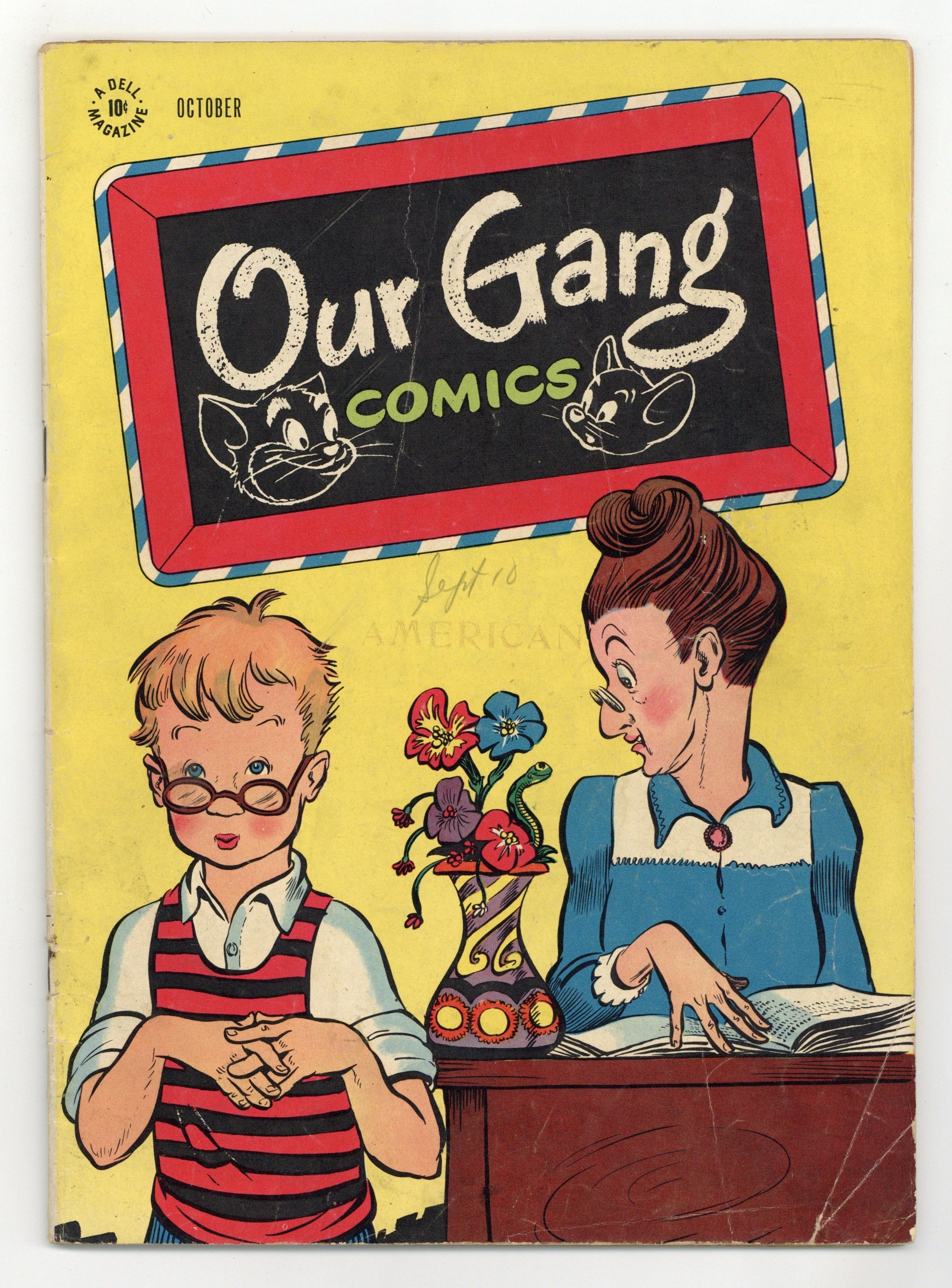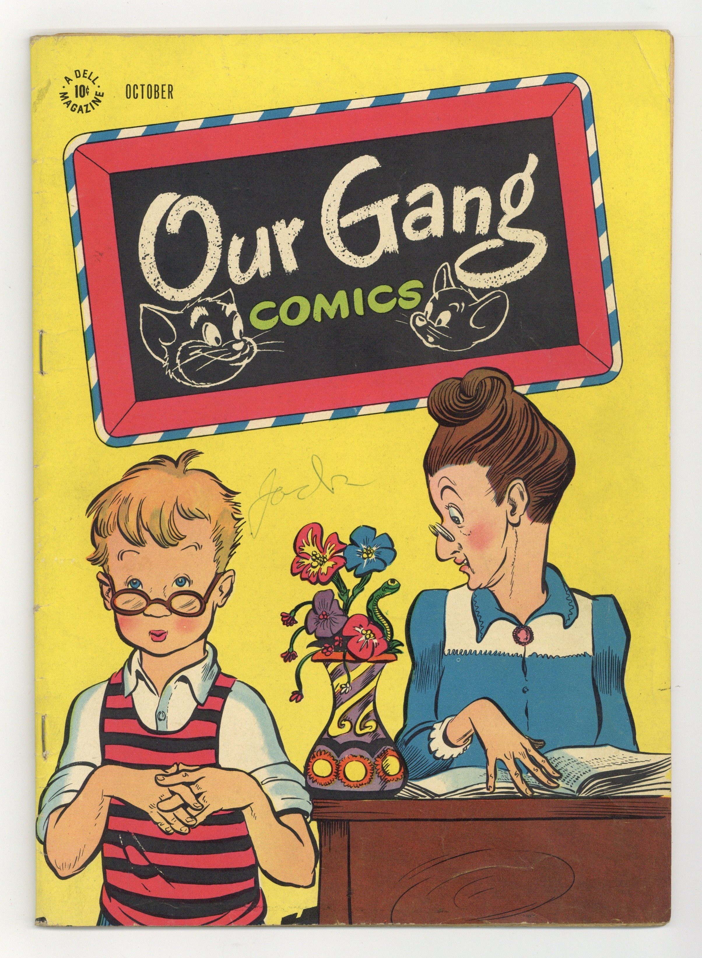 Cover by Walt Kelly. Stories and art by Walt Kelly, Carl Barks, Tom Hickey, H. R. McBride and Vive Risto. Based on the popular movie shorts also known as Little Rascals, Dell's Our Gang Comics featured early work by Pogo's Walt Kelly and other cartooning greats. In a story by Kelly, the gang makes a bid for stardom with Professor Gravy's circus, if they can prove that Julep the goat can talk. This story features a few self-portrait cameos by Walt Kelly. Barney gets a job as a dog catcher, in an early story by legendary Uncle Scrooge creator Carl Barks. Jerry uses ink against Tom. Slippy the Snail; Our Gang; Flip 'n' Dip; Tom and Jerry; Barney Bear and Benny Burro; Mr. Cuckoo Moves In; Wuff the Prairie Dog. 48 pages, Full Color. Cover price $0.10.