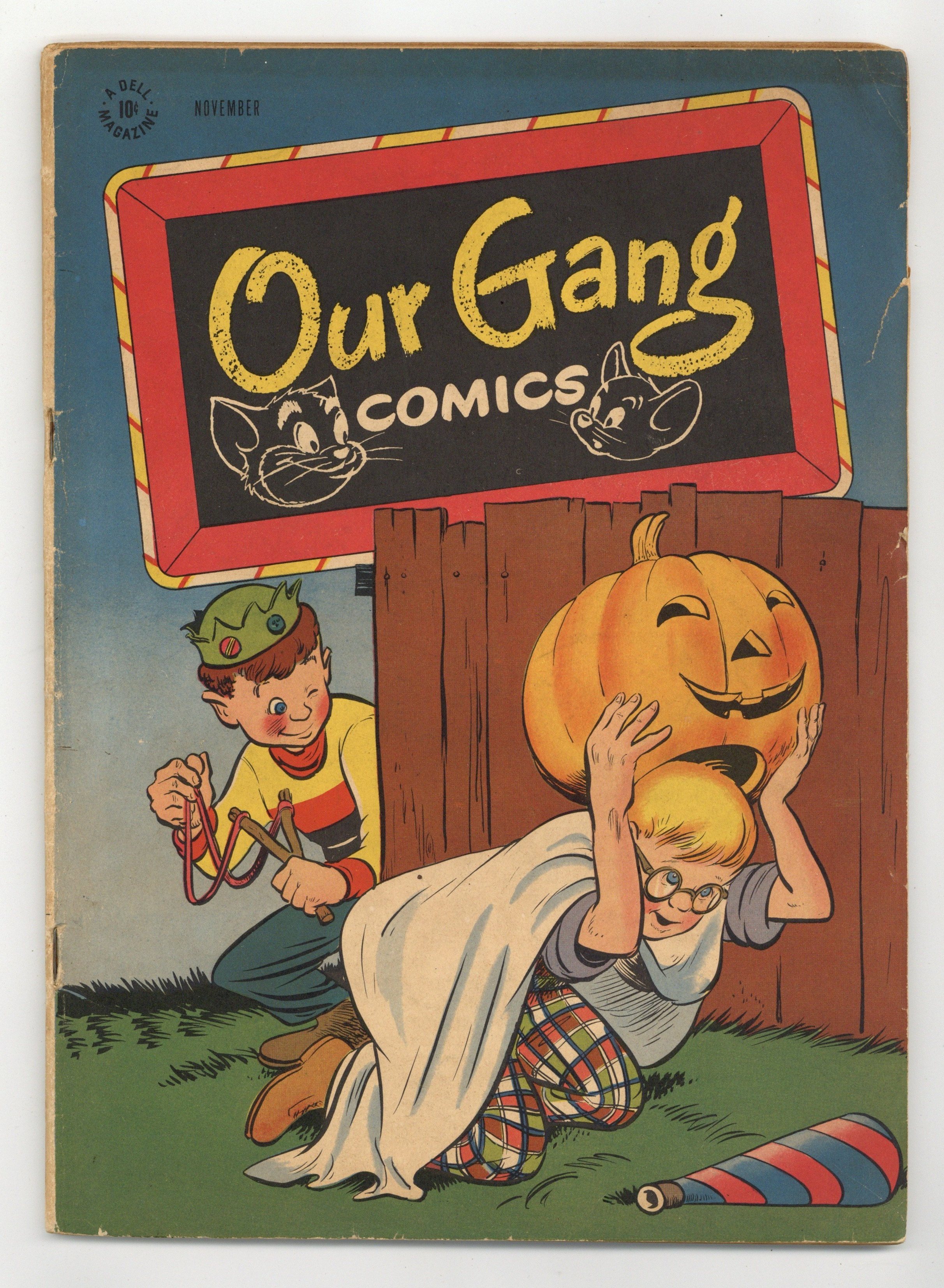 Cover by Walt Kelly. Stories and art by Walt Kelly, Carl Barks, H. R. McBride and Vive Risto. Based on the popular movie shorts also known as Little Rascals, Dell's Our Gang Comics featured early work by Pogo's Walt Kelly and other cartooning greats. In a story by Kelly, crooks try to steal a racehorse, and take the horse costume containing Red and Froggie instead. Barney Bear tries to paint a landscape, in an early story by legendary Uncle Scrooge creator Carl Barks. Tom catches Jerry and Tuffy spinning around on the phonograph music player, and decides to have some fun. The Unlucky Cricket; Our Gang; Flip 'n' Dip; Tom and Jerry; Barney Bear and Benny Burro; Timothy's Competition; Wuff the Prairie Dog. 48 pages, Full Color. Cover price $0.10.
