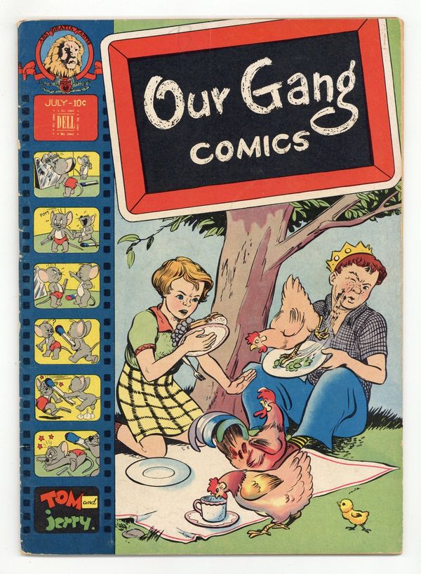 $40.00Cover by Walt Kelly. Stories and art by Walt Kelly, Carl Barks, Don Lang, Charles Hedinger and Vive Risto. Based on the popular movie shorts also known as Little Rascals, Dell's Our Gang Comics featured early work by Pogo's Walt Kelly and other cartooning greats. In a story by Kelly, the gang's goat Julep is captured by the wandering con man Deacon the Dip. The kids try to put together a performing animal act to trade for Julep. Barney Bear seeks the mysterious thief who is stealing watches, in an early story by legendary Uncle Scrooge creator Carl Barks. Jerry and Tuffy; Our Gang; Flip 'n' Dip; Tom and Jerry; Barney Bear and Benny Burro; Tillie Runs Away; Wuff the Prairie Dog; Pictopranks. 48 pages, Full Color. Cover price $0.10.
