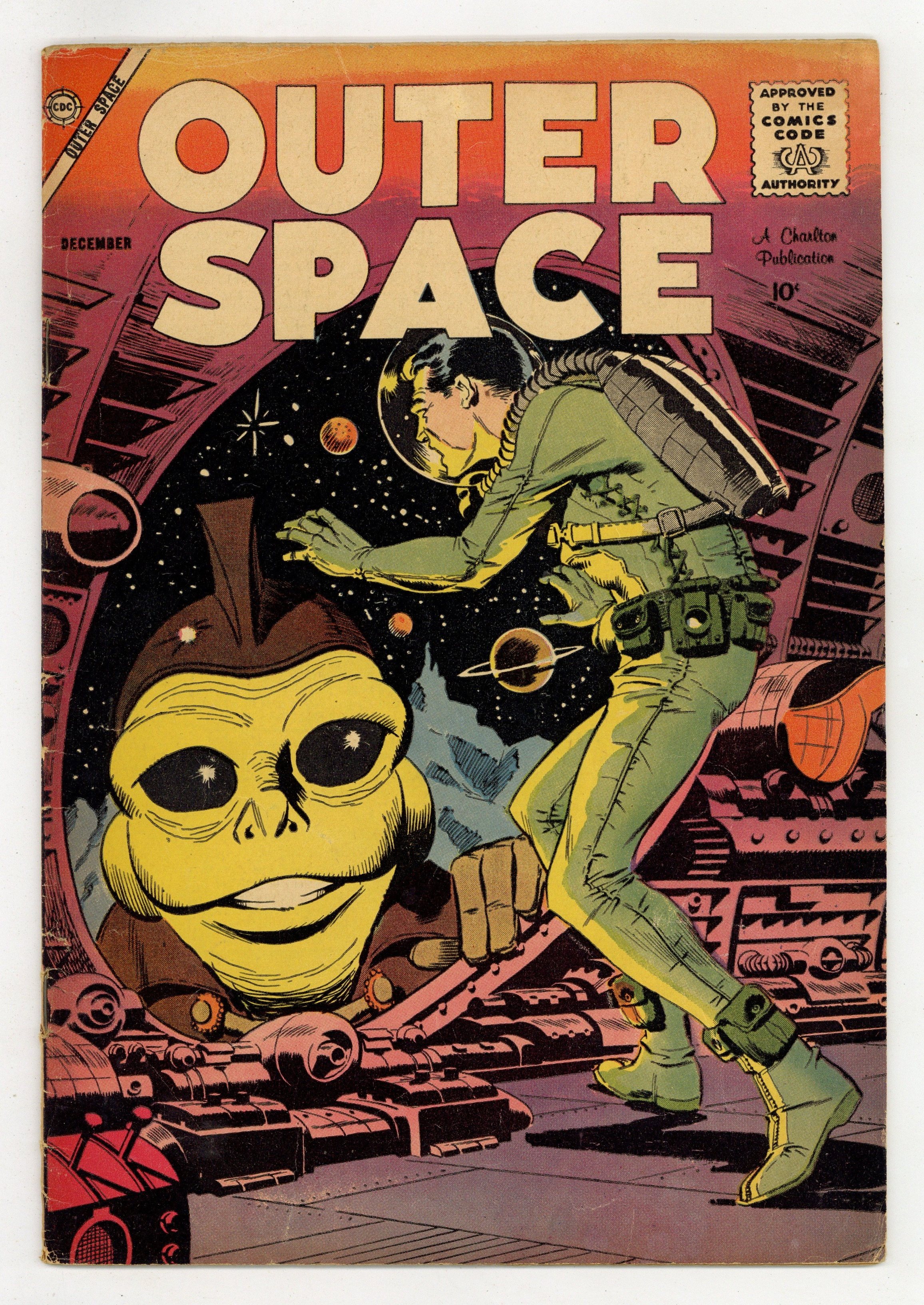 Cover by Dick Giordano. Stories and art by Steve Ditko and Vince Alascia. Science fiction comics with a space-exploration theme from Charlton, perfect for the age of Sputnik. The inhabitants of Jupiter, the tiny Lesser Jovians and giant Greater Jovians, must work together to solve their food shortage, in a story with art by Spider-Man co-creator Steve Ditko. In another Ditko story, cartoony aliens deal with genetic engineering gone wrong. The inventor of a superior hearing aid starts picking up messages that he can't explain. The Greater Jovians; Misfits; Gold Greed; Poor Pennies; Space Saver; Too Fantastic; Far Away Voices. 32 pages, Full Color. Cover price $0.10.