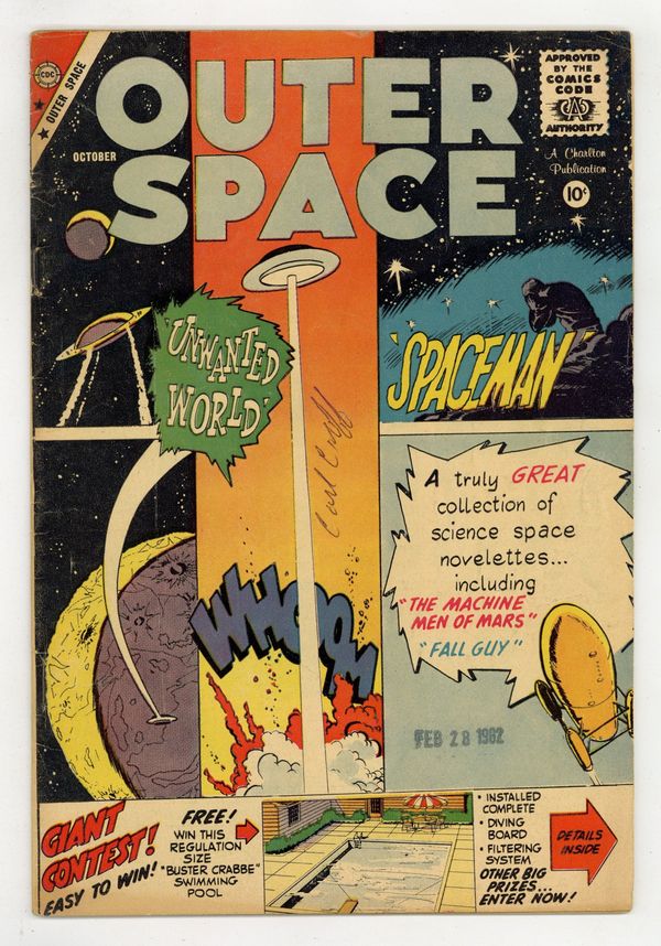 Stories and art by Matt Baker, Vince Colletta, Bill Molno, Vince Alascia, and Maurice Whitman. Science fiction comics with a space-exploration theme from Charlton, perfect for the age of Sputnik. Only Captain Moreno and his crew can stop an invasion by The Machine Men of Mars. The first astronauts on the dark side of the moon discover survivors of the lost city of Atlantis. A ham-radio hobbyist receives a transmission from an alien world, in a story with art by good-girl art legend Matt Baker. Unwanted World; Spaceman!; Solution in Space; The Machine Men of Mars; Fall Guy. 32 pages, Full Color. Cover price $0.10.