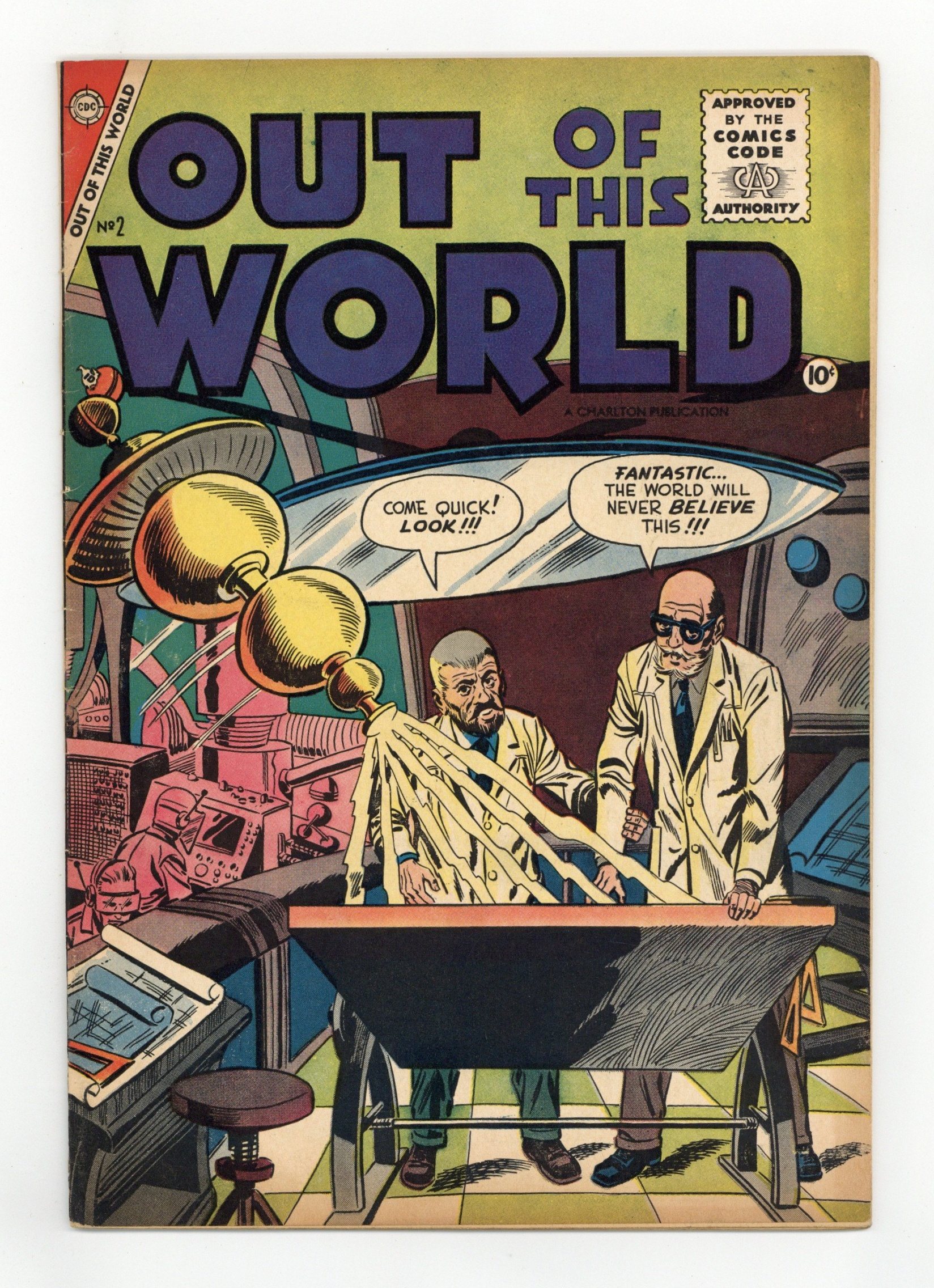 Cover by Bill Molno and Vince Alascia. Stories and art by Sal Trapani, Charles Nicholas, Vince Alascia and Bill Molno. Charlton responds to the new Comics Code with kid-friendly tales of science fiction, often illustrated by Steve Ditko or other future comics legends. His colleagues think Dr. Petrie has lost his mind when he conjectures that science connects with occult forces - and then the aliens show up. Space travelers Arnie and Pete make a stopover on Venus, where they meet beautiful Venusian woman Vinye. Jack meets his exact double, Bill, when he repeatedly saves Bill's life. The Man with a Screw Loose; Take Warning, His Other Self; Moon Farm; The Space Warp; Venus Stopover. 32 pages, Full Color. Cover price $0.10.