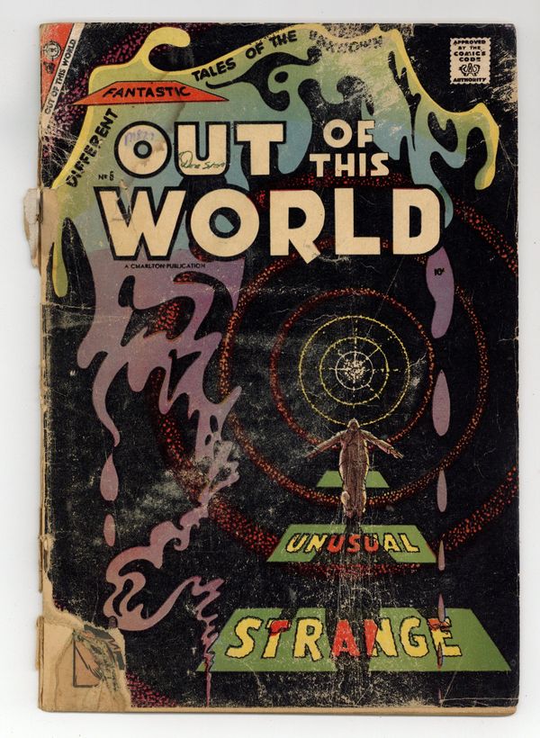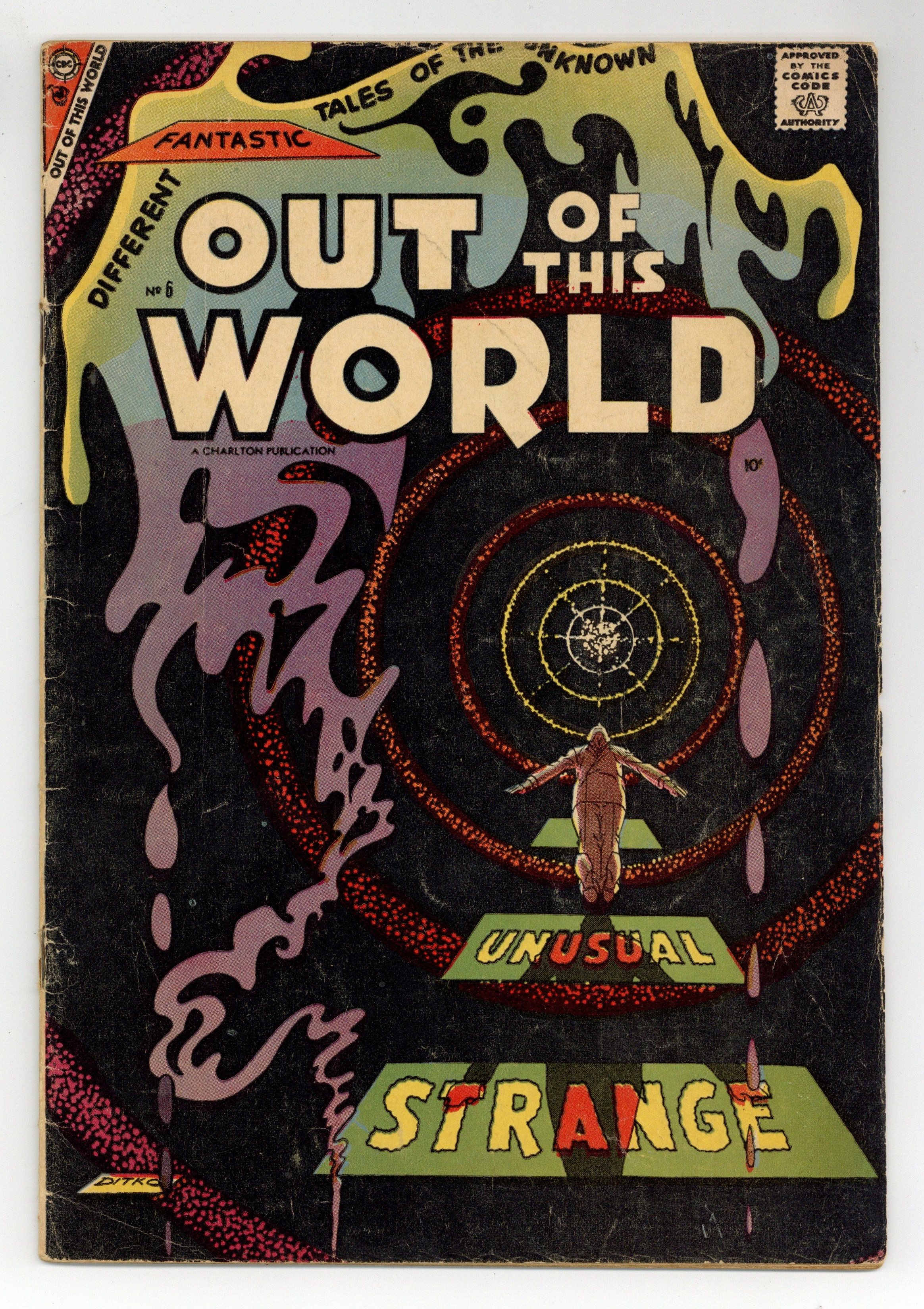 Cover by Steve Ditko. Stories and art by Steve Ditko, Bill Molno and Vince Alascia. Charlton responds to the new Comics Code with kid-friendly tales of science fiction, often illustrated by Steve Ditko or other future comics legends. A spy is a master of disguise, but there's one angle he's overlooked, in one of several stories in his issue with art by Spider-Man co-creator Steve Ditko. In another Ditko story, a sentient river rebels against human efforts to channel it. A scientist figures out how to save humanity by freezing it for a year with a designer pathogen. All Those Eyes; The Rivers Wrath; The Secret Room; Inside the Imagined Image; Plague; A Caveman Named Smith. 36 pages, Full Color. Cover price $0.10.