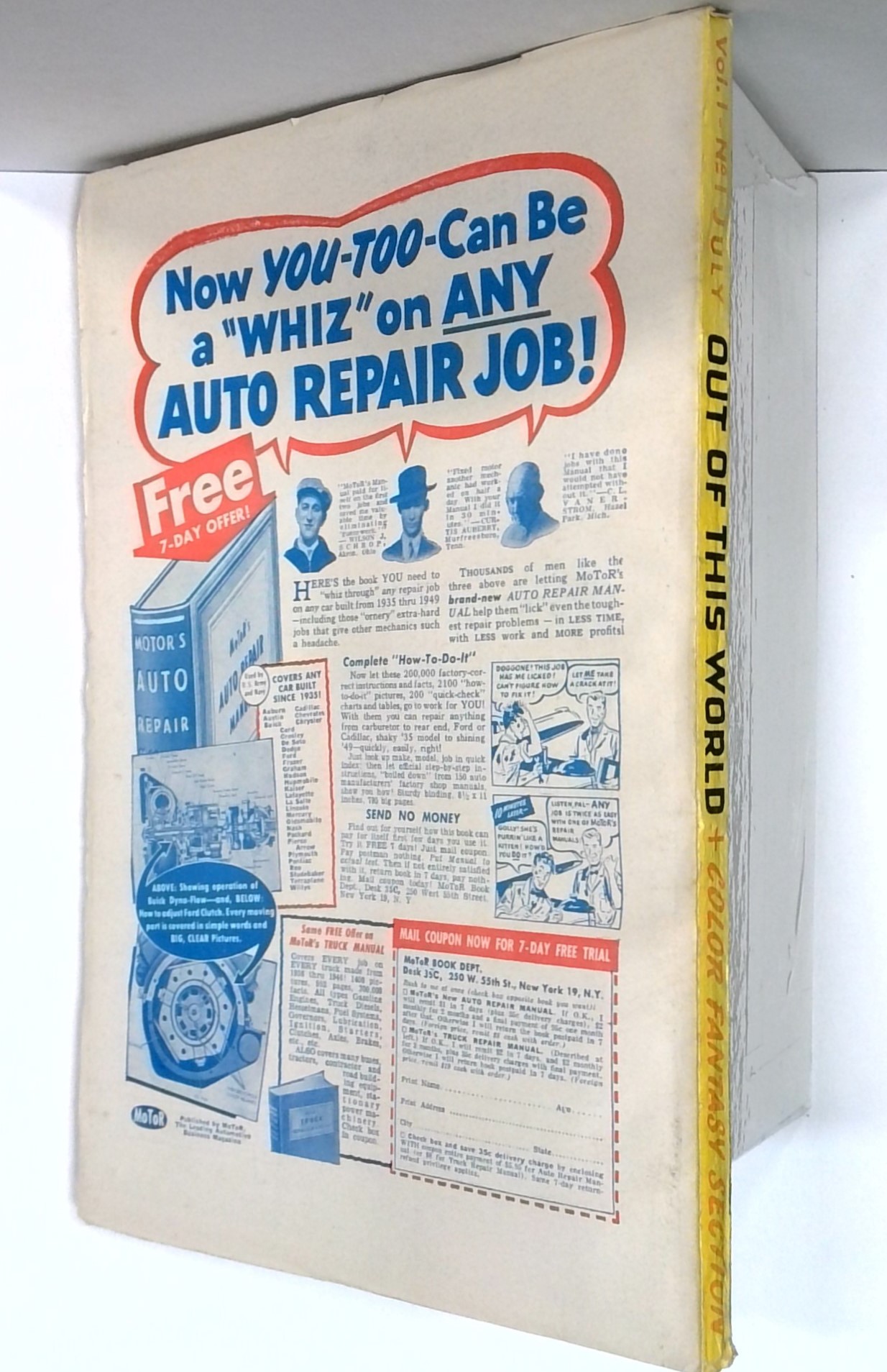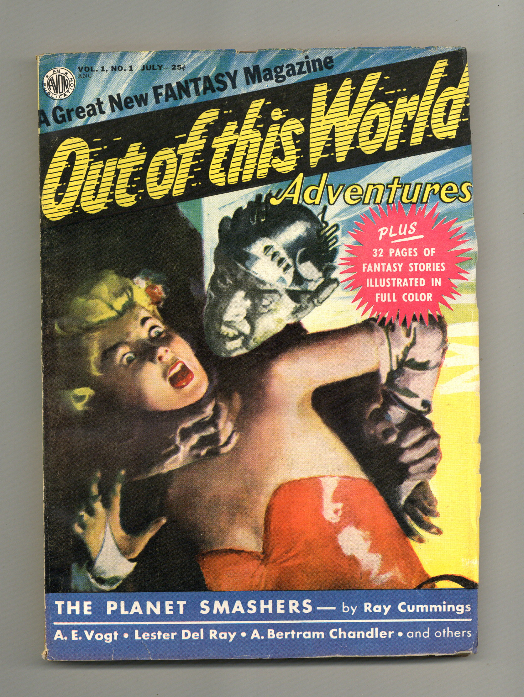 Volume 1, Issue 1 - July, 1950. 32 page illustrated color section contains reprints from Avon's comic book titles "Out of This World" & "Strange Worlds" with art by Joe Kubert and John Giunta. Science Fiction stories "The Planet-Smashers" by Ray Cummings, "Letter from the Stars" by A.E. Van Vogt, "Omega and the Wolf-Girl" by Lester del Ray, "The Puzzle of Priipiirii" by William Tenn, "The Shipwrecked Bogey Man" by Lloyd Williams, "Terror of the Mist-Maidens" by A. Bertram Chandler, "The Discord Makers" by Mack Reynolds, and "Forbidden Fruit" by Kris Neville. Illustrations by Martin and William F. McWilliam. 7" x 9 3/4"; black and white/color; 132 newsprint pages. Cover price $0.25.