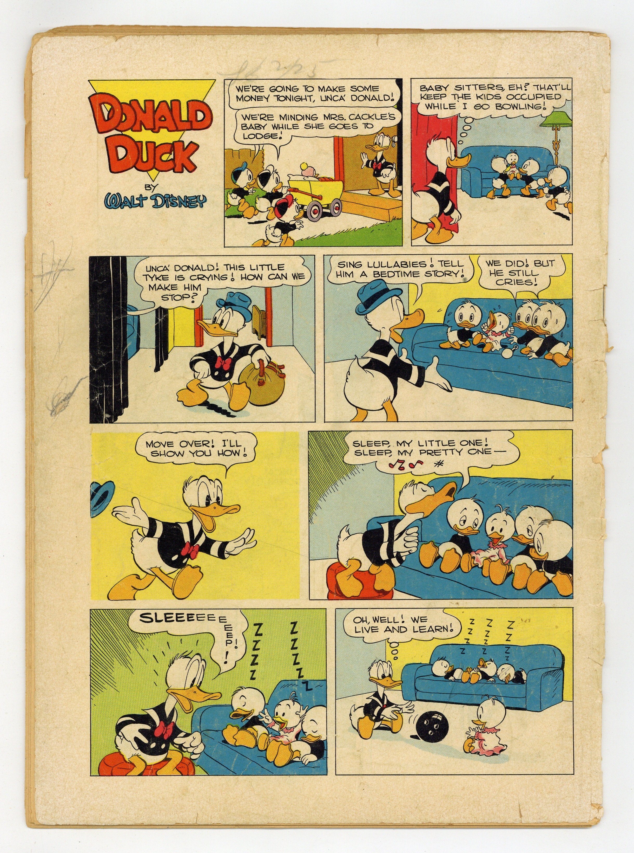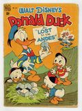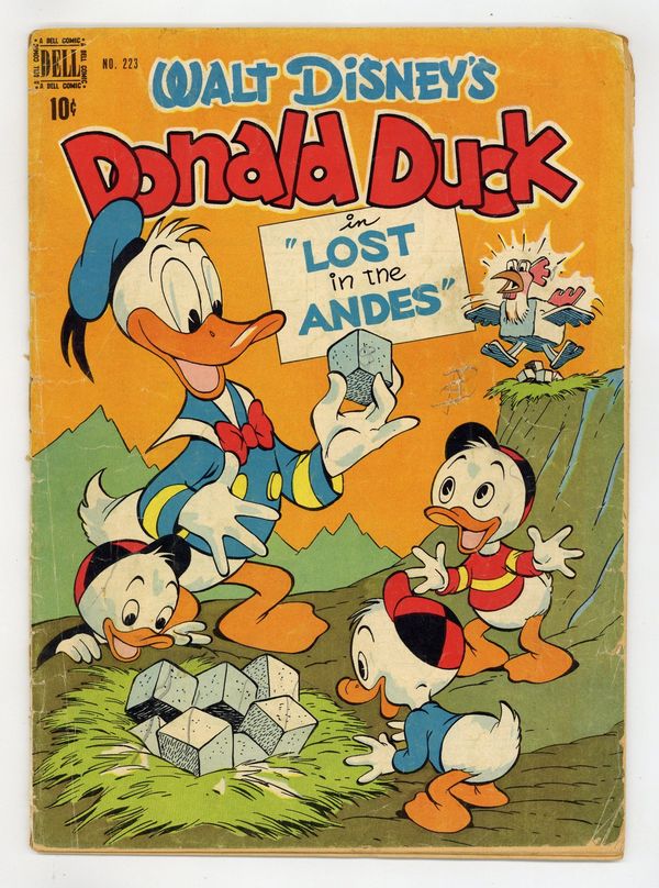 Indicia title is "Walt Disney's DONALD DUCK in "LOST IN THE ANDES", No. 223." Cover art by Carl Barks. Lost in the Andes, script and art by Carl Barks; Donald, a museum janitor, discovers that some "blocks" from Inca ruins are actually square eggs; When the other members of a scientific expedition fall ill, Donald and the nephews press on alone deep into the Andes; There they find a strange race of people who speak with Southern accents and live on the square eggs. Too Fit to Fit one-page story; Donald exercises so that he can fit into his tuxedo again. Tunnel Vision one-page strip; Donald ends the nephews' fighting over the television. Sleepy Sitters; Donald helps the nephews to baby-sit by singing a lullaby. Art by Carl Barks. 36 pages, full color. Cover price $0.10.
