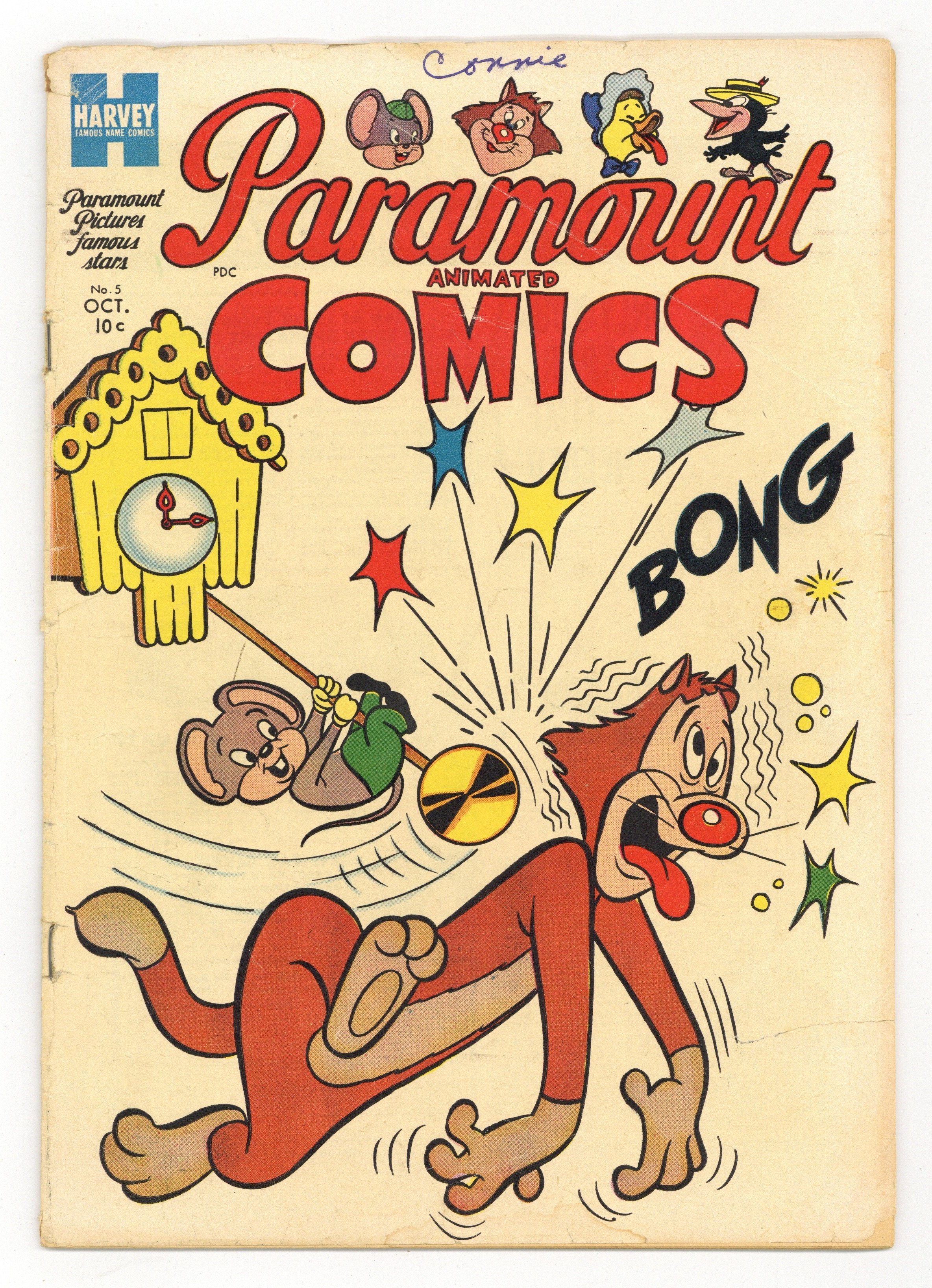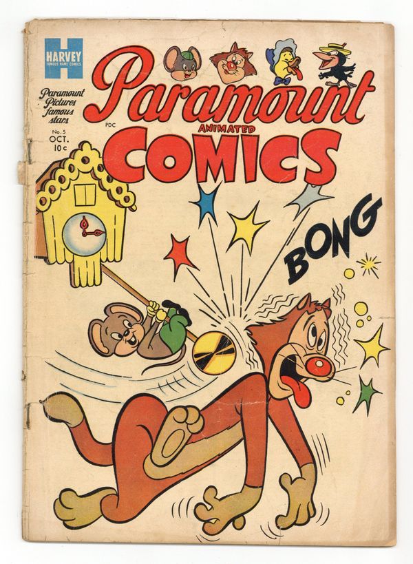 Cover by Dave Tendlar. Stories and art by Marty Taras and others. Harvey presents characters licensed from Paramount's Famous Studios, the most famous of which is super-sized duckling Baby Huey. Papa's attempts to teach Baby Huey how to swim are complicated by the appearance of a shark. Percy and Tuffy Pig debate the pros and cons of going to school. Herman and Katnip: School Daze; Well-Schooled; Puzzle Page; Baby Huey: Bathing Beauty; Buzzy: The Superstitious Cat; Animal Antics; Baby Huey: Apple Sap; Herman and Katnip: Mouse A-Cat-Emy. 32 pages, Full Color. Cover price $0.10.