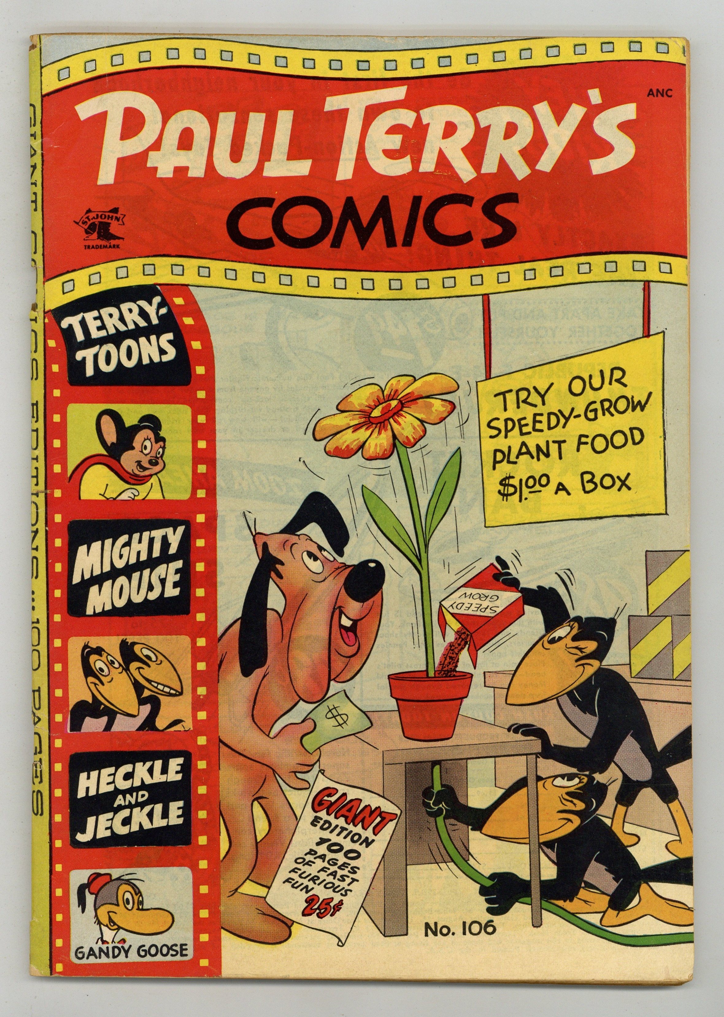 Art by Jim Tyer and Vic Lockman. Animator Paul Terry's Terrytoons featured Mighty Mouse, Heckle & Jeckle, and other classic cartoon characters of yesteryear. 100-page giant. Cat mad scientist Dr. Caden transforms ordinary mice into gigantic, mindless slaves who capture Mighty Mouse. Heckle and Jeckle set out to make money off their antique clock - legit or otherwise. Papa Bear, modeling a dress for Mama Bear, must run through city streets in the dress after an errant wind whisks away the dress design. Plus a Mighty Mouse "Flight to the Moon" activity page, and a vintage ad for "Space Commander Vibro-Matic Walkie-Talkies." Heckle and Jeckle: A Lot of Nerve; Chesty: Phony Money; Terry Bears: From Bad to Worse; Little Roquefort: The Shanghaied Cat; Dimwit: All Washed Up; Heckle and Jeckle: Bundles of Bouquets; Mighty Mouse and the Army of Giants; Chesty: Phony Money; Mighty Mouse: Flight to the Moon; Dimwit: The Chimney Cleaner; Dinky: Call of the Wild; Farmer Gray: Car Hop; Heckle and Jeckle: The Legacy; Dinky: A Red Hot Lesson; Gandy Goose: The Plotter; Salesman Sourpuss; Dinky: A Painful Memory; Little Roquefort: Wrong Evidence. 100 pages, Full Color. Cover price $0.25.