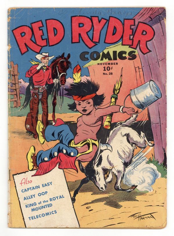 Cover art by Fred Harman. Strong Shirt text story starring Little Beaver, art by Fred Harman. Red Ryder, script and art by Fred Harman. Zane Grey's King of the Mounties. Captain Easy. Freckles and His Friends. Telecomics. Biff Baker, script and art by Henry Lee. Alley Oop strip. Boots humor page. 36 pages, full color. Cover price $0.10.