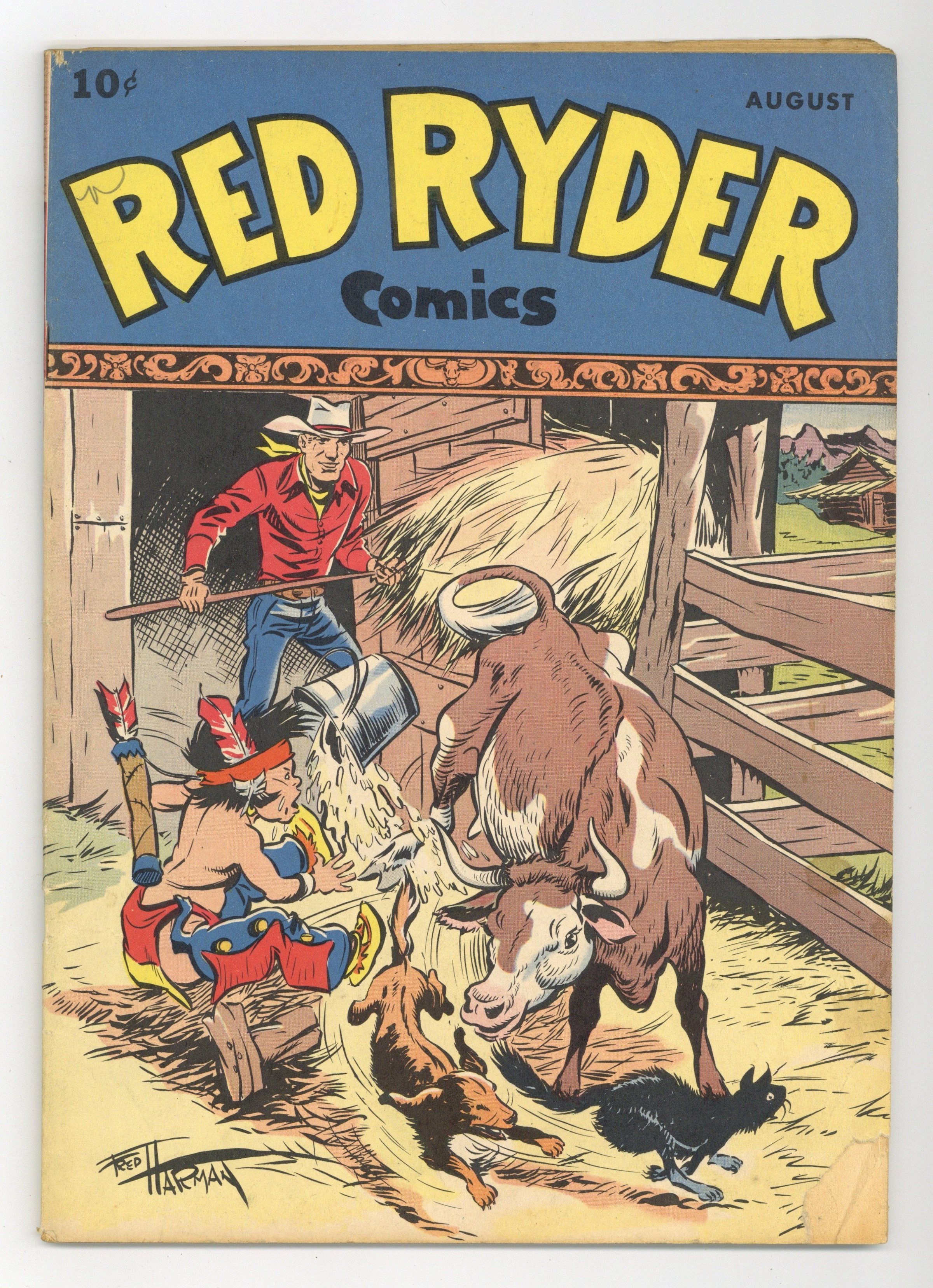 $8.00Cover pencils by Fred Harman. News From Red Ryder Ranch text article, script and pencils by Fred Harman. Red Ryder, pencils by Fred Harman. Zane Grey's King of the Royal Mounted featuring Telecomics. How to be a Cowboy starring Red Ryder, pencils by Fred Harman. Three-page text story, Little Beaver's Bad Man. The Kiyotee Kids. Panamint Patty, pencils by Dan Gormley. Photo back cover (Red Harmon, creator of Red Ryder). 52 pages, full color. Cover price $0.10.